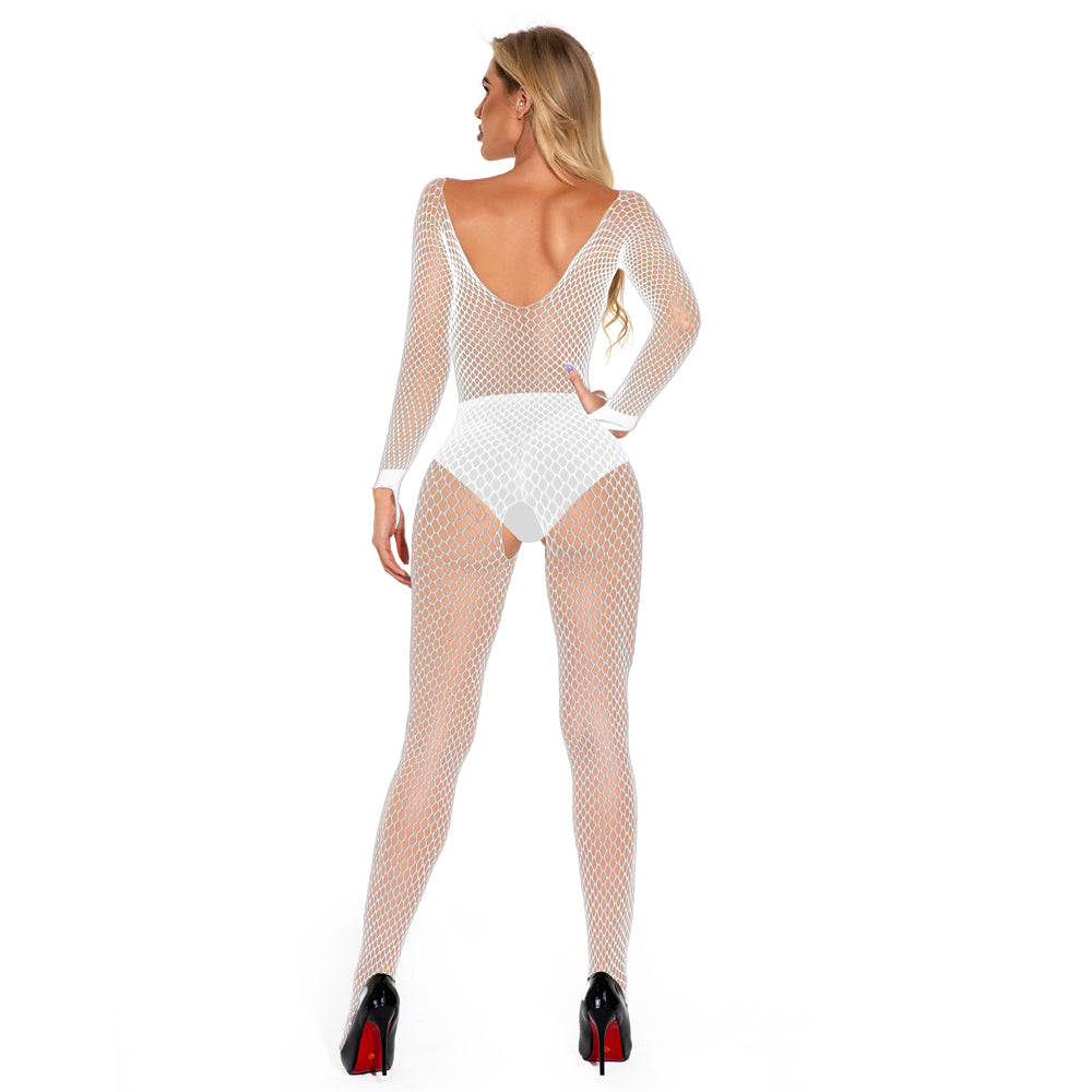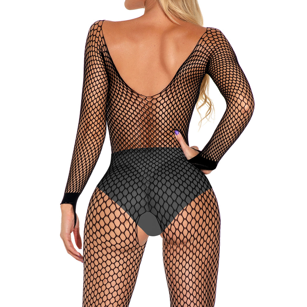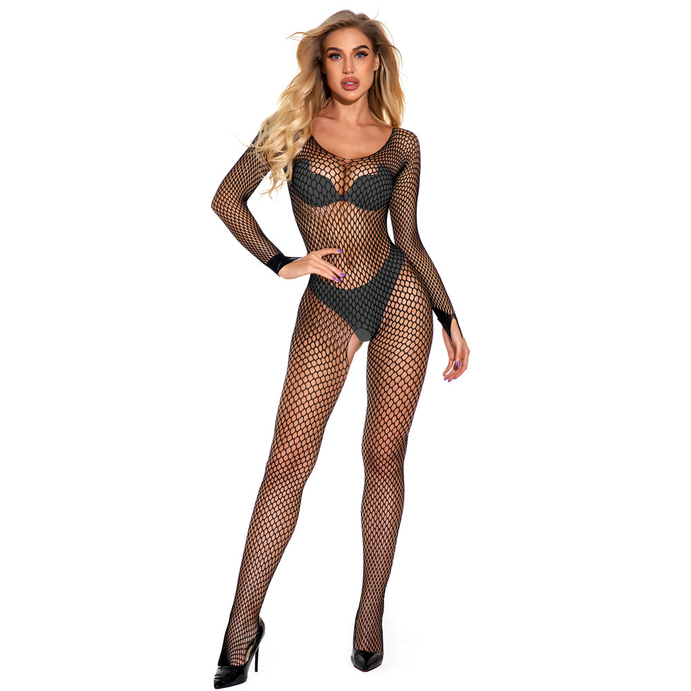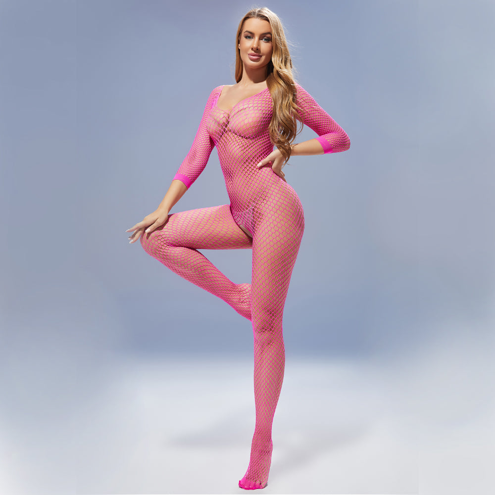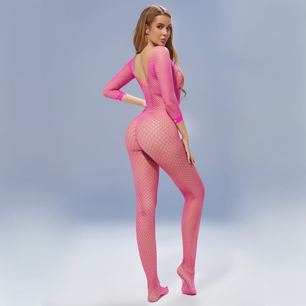 Flaunt your figure in style with Cerise's Long Sleeve Crotchless Fishnet Bodystocking!