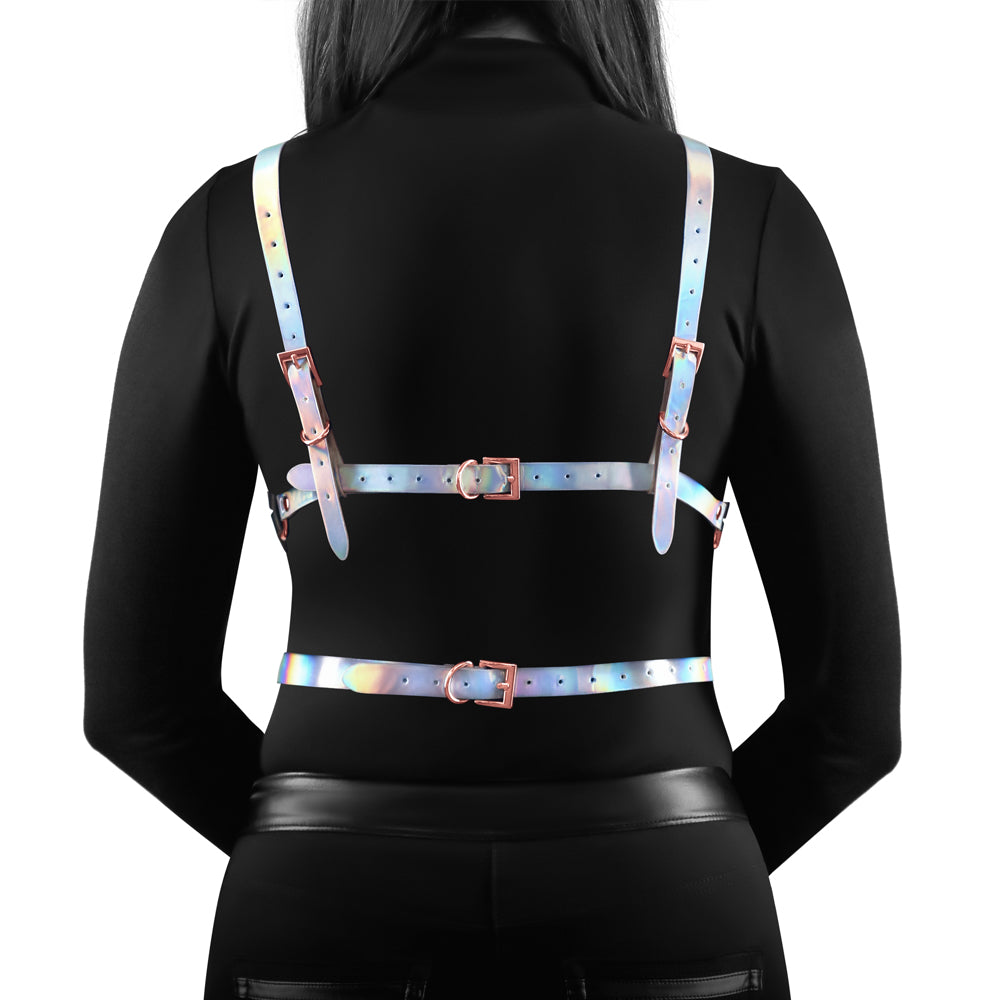 Look utterly bewitching in the Cosmo Risque Holographic Rainbow Pentagram Chest Harness!