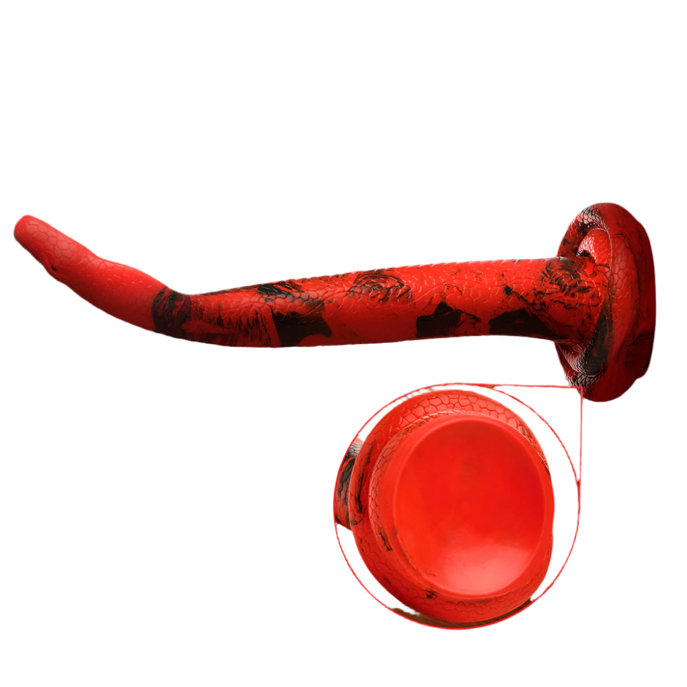 This monstrously massive dildo is sculpted from premium red and black silicone in a lifelike serpent shape, complete with a scaly texture and ridged belly that add extra sensation against your inner walls while also holding onto lubricant for a smooth and slippery ride! The tapered nose is easy to insert and bulges out into a wide, flared neck to fill you up as soon as you slide the thick, flexible shaft inside yourself. The powerful coiled body at the base makes this huge dildo safe for vaginal or anal penetration and forms a strong suction cup that mounts to flat, firm surfaces for hands-free riding fun! If you're feeling generous, you can even slip this serpent into a strap-on harness and show your lover just how good a snake charmer you are...