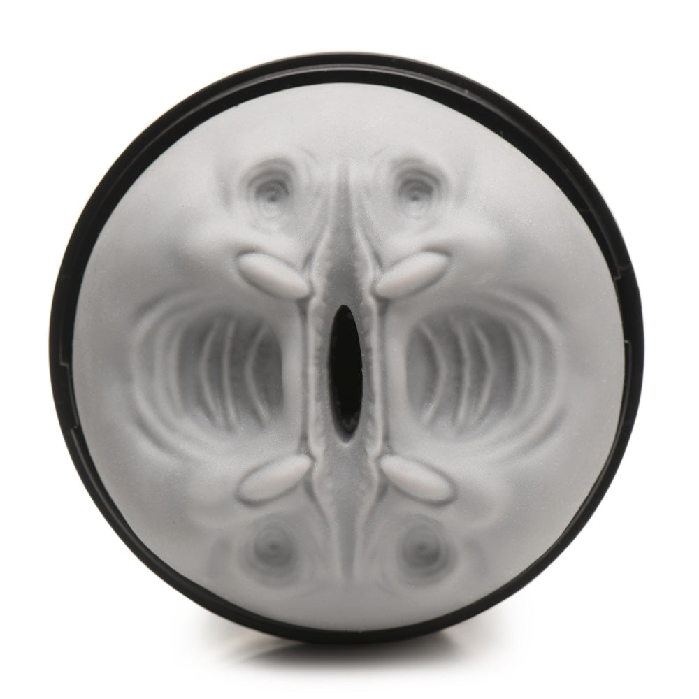 This pale grey masturbator will bring your sci-fi and horror fantasies to life with its otherworldly design, complete with indented, cone-like dimples on either side of the strangely enticing alien entrance. Once you're inside, the plush TPE material surrounds your throbbing erection with an incredibly soft tunnel textured with nubs, ribs, and grooves to massage you all over to an intense climax that'll leave you breathless. You can increase the suction and pressure intensity by keeping the silicone plug at the base of stroker in place, or remove it for less pressure and an easier glide!