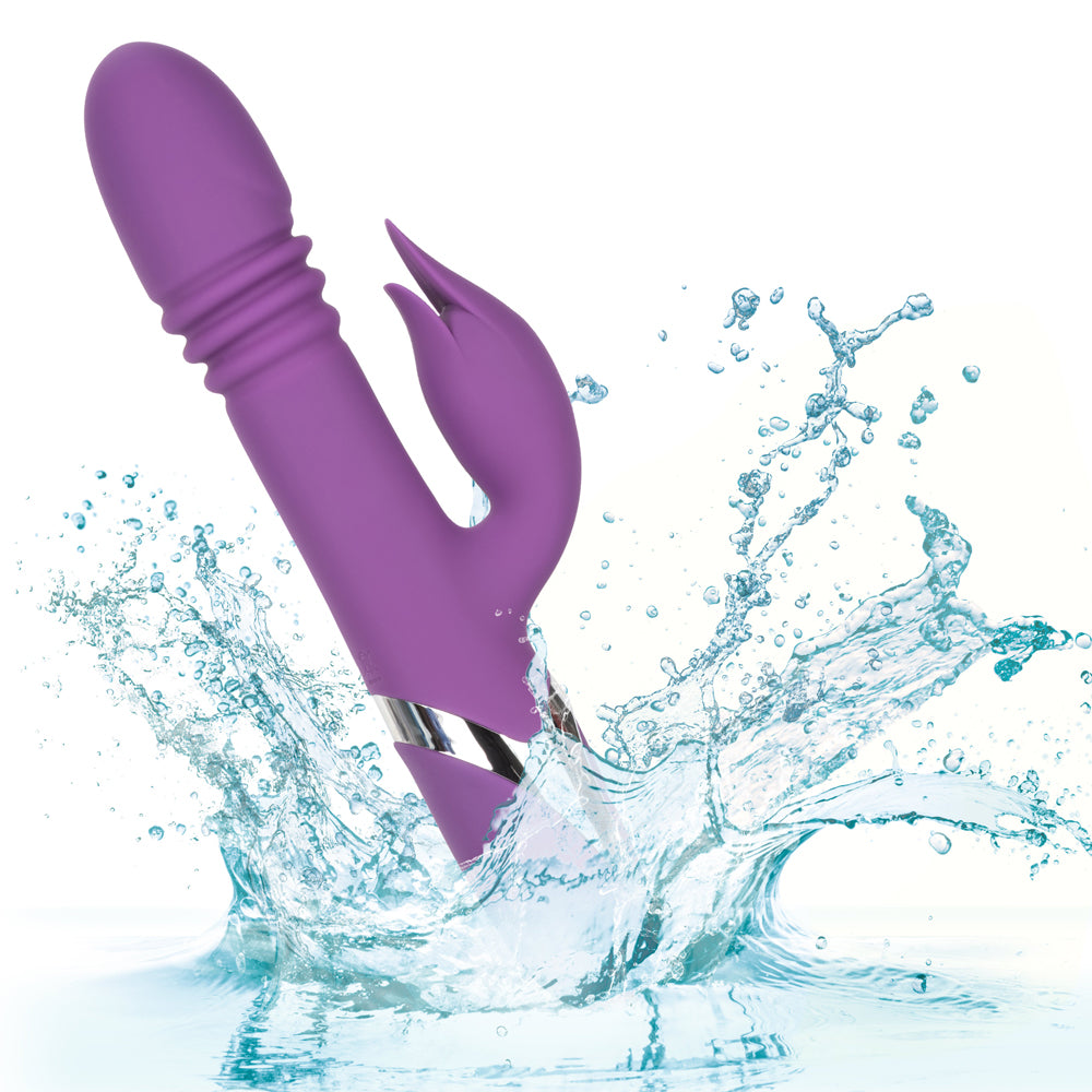 The Enchanted Kisser - Thrusting Rabbit Vibrator sports a seamless silicone body and a self-sealing charging port that keeps this toy waterproof, even when fully submerged underwater. It is rechargeable for endless fun and provides almost an hour of high-speed stimulation, perfect for taking from the bathtub to the bed...