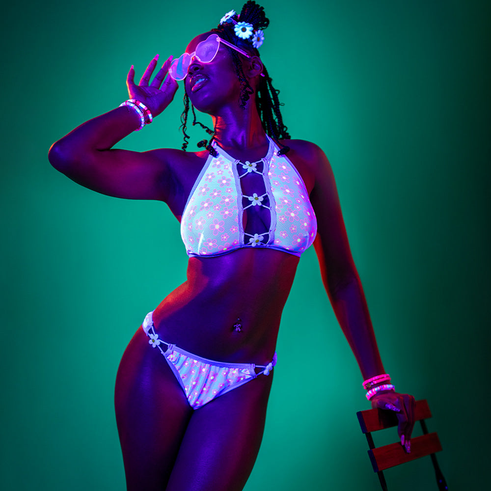 Let your inner flower child out to play at your next UV party or nightclub glow event in the Daisy Charm UV-Reactive Halter Bralette & Panty Set from Exposed®!