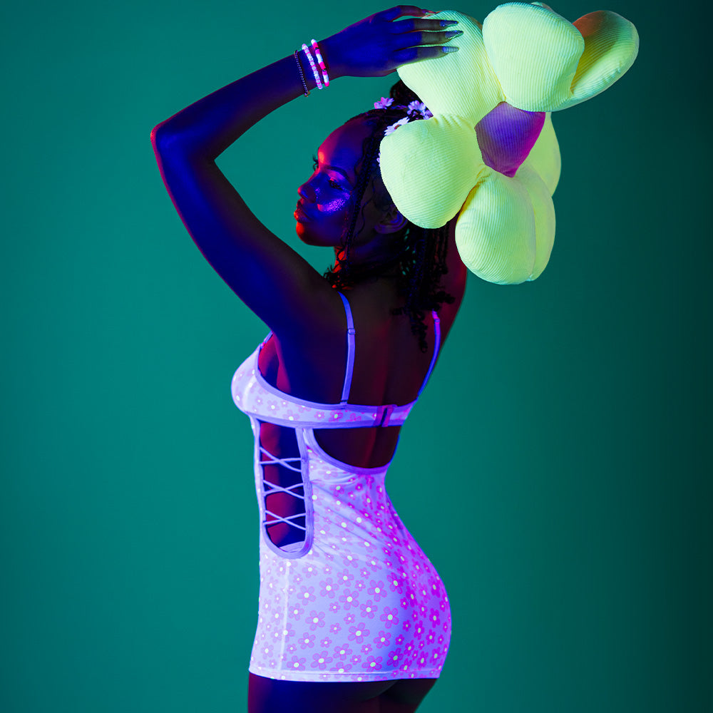 Key features of the Exposed Daisy UV-Reactive Strappy Cutout Dress & Thong Set: