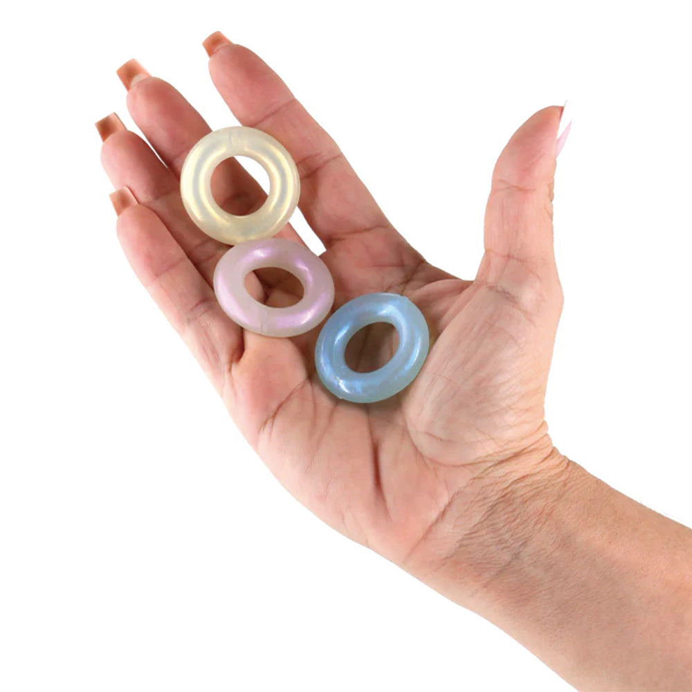 This triple-pack of simple yet effective cock rings is the ultimate accessory for extending your erotic encounters and are made from super-stretchy jelly-like TPE in a trio of iridescent colours. Each ring fits snugly around your shaft to restrict blood flow away from your erection, helping it stay harder for longer, which also results in a more explosive orgasm for your most powerful finish ever—wear them one at a time, or wear multiple rings together for a more pronounced erection-enhancing effect!