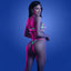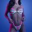 This revealing lingerie set is made from ultra-sheer nude mesh at the cups and crotch, lined with straps that glow neon green and pink in UV lights, perfect for creating a contrast cage strap effect that's sure to pop off at glow parties and rave events! The underwired bra offers shaping and support while the strappy design allows tantalising glimpses of skin to peep through the transparent mesh in a playful peekaboo effect. The matching panties keep this striped motif going in front and reveal your buns to the max with its cutout thong rear! This lingerie set is great to wear on its own or you can layer it under other party attire for a fun pop of glow-in-the-dark colour that's sure to have heads turning your way...