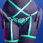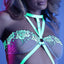 This barely-there teddy wraps you in glow-in-the-dark cage strap details from neck to thigh, complete with matching GITD floral embroidery against the sheer mesh bra and panty for a floating effect in the dark. A V-shaped collar detail encircles your neck while the two side straps stretch over your back to form criss-cross shoulder straps above a hook-and-eye bra closure. Meanwhile, the rest of the straps form a diamond-shaped open bodice design over your navel to highlight your curves and attach in the rear with a simple swan hook for easy wear or removal. The bikini-cut panties offer medium coverage while the suspenders offer a sexy thigh-high gartered effect without needing separate stockings. The garters are also detachable, giving you more ways to wear your Night Vision Teddy from anywhere between the bedroom to a black light party to a festival after dark!