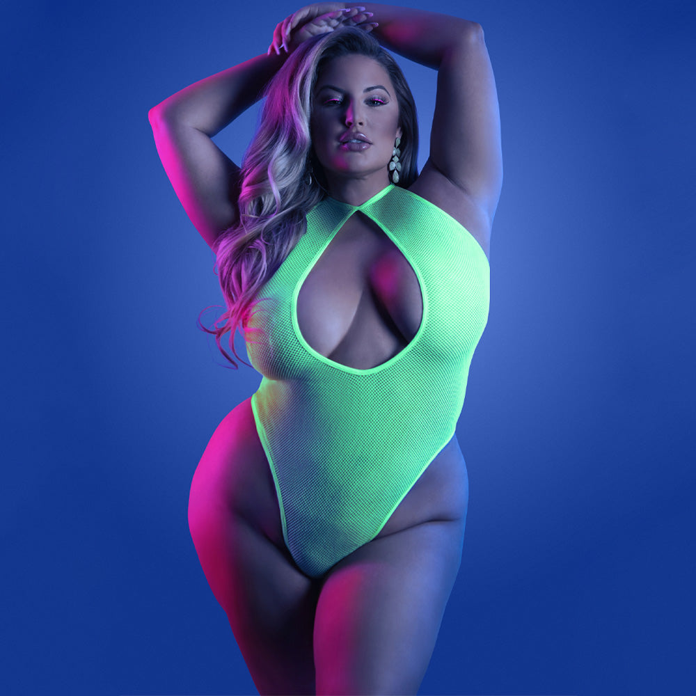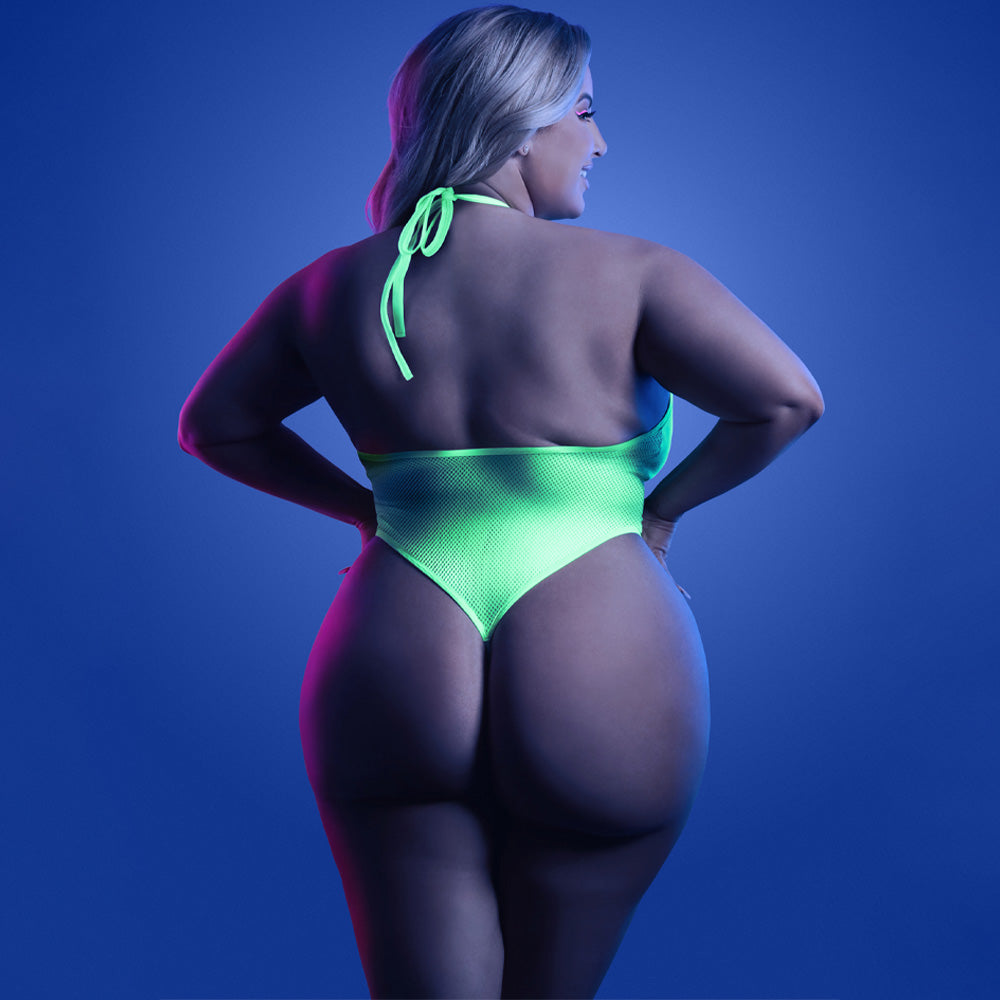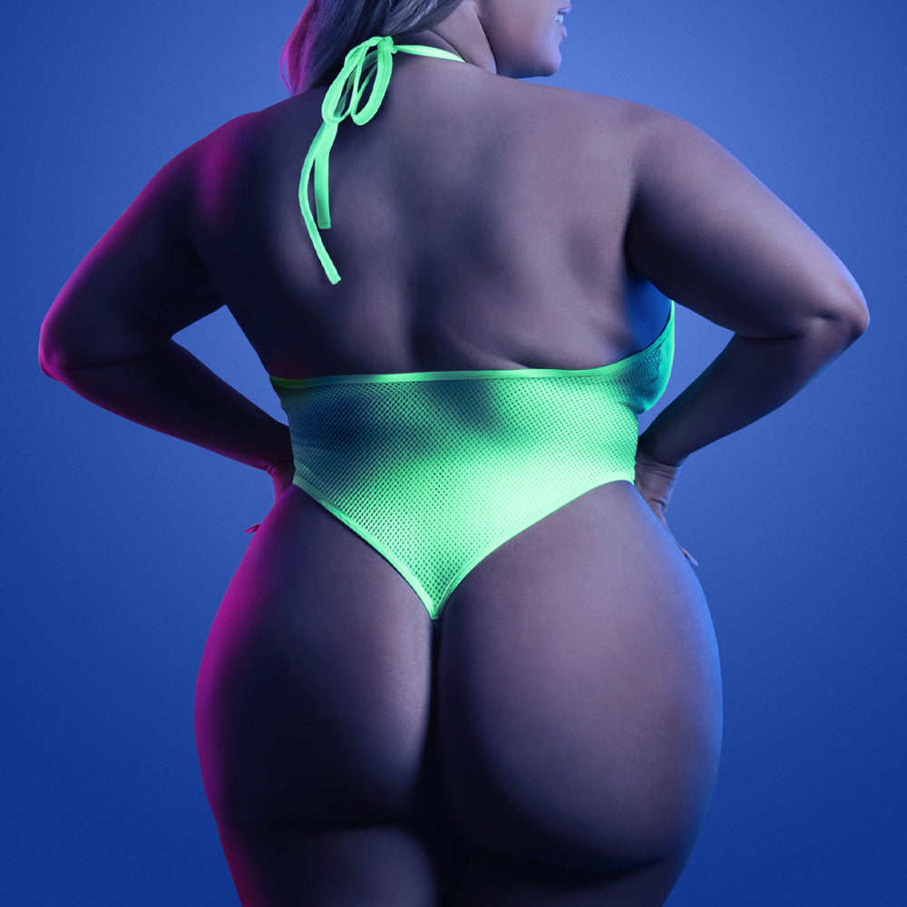 Brighten up any festival, rave, or party, day or night in the Plus-Size Nocturnal Halter Keyhole Thong Teddy from Fantasy Lingerie's® Glow range!