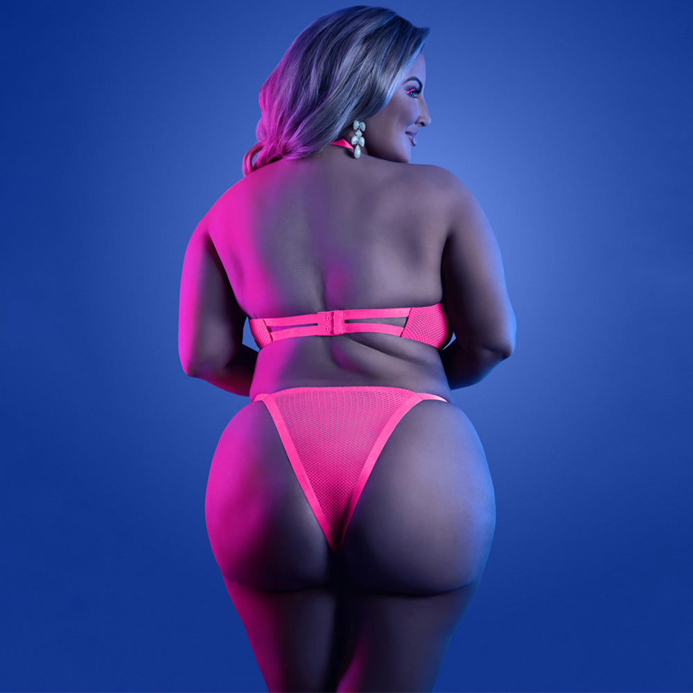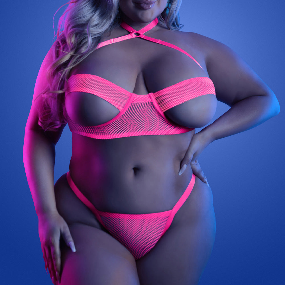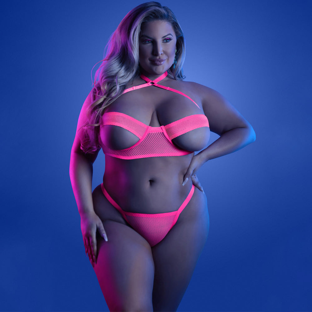 This fun lingerie set for fuller figures is made from breathable net material that glows in the dark and is UV-reactive to shine extra-bright under black lights. The underwired bra lifts and supports your bust while cheeky peekaboo cutouts reveal tasty windows of underboob to captivate onlookers. The adjustable halter straps meet at the base of your neck and form a sexy collar detail, complete with a metal O-ring that's compatible with BDSM accessories (sold separately) like rope, leashes, and cuffs so you can show everyone that you know how to really party...