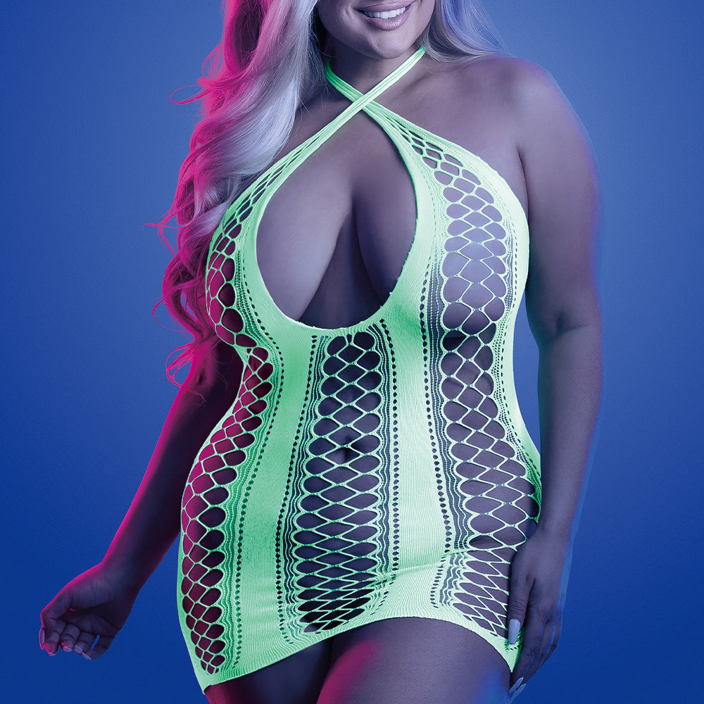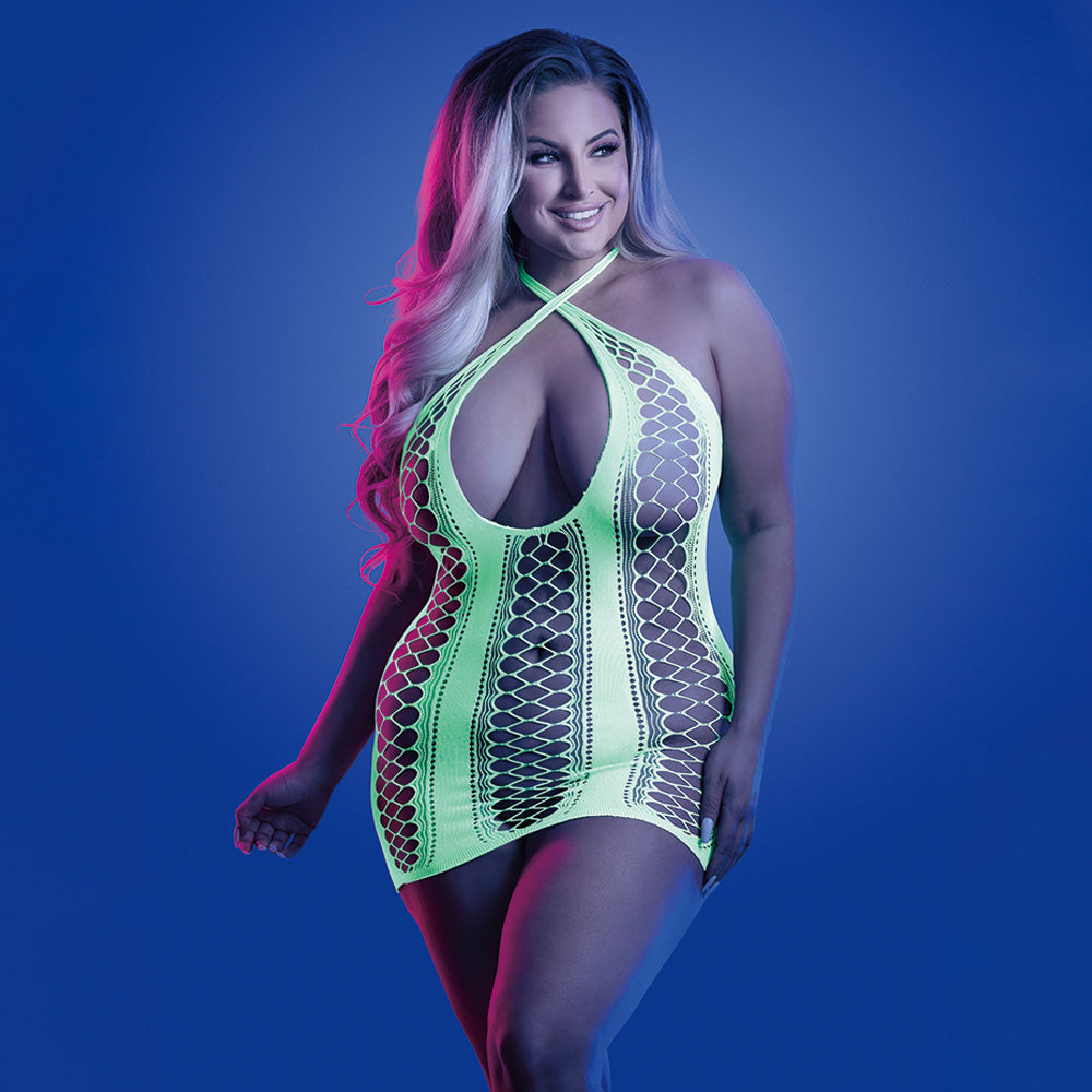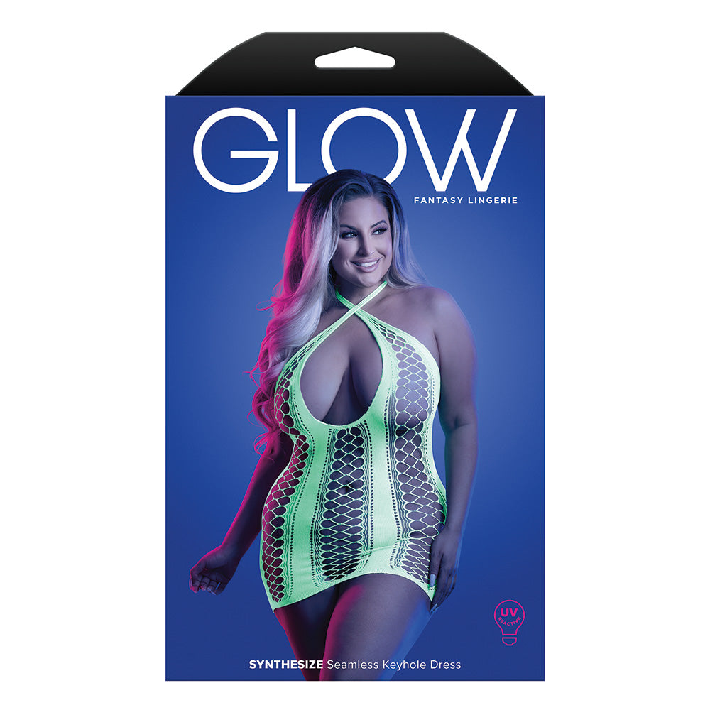 Glue all eyes to you at your next glow-in-the-dark event in the Plus-Size Synthesise Seamless Keyhole Dress from Fantasy Lingerie's® Glow range!
