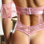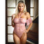 This flirty one-piece flaunts your curves in a feminine shade of baby pink, with floral lace patterning and floaty off-shoulder sleeves to add even more cute charm to this look. In the rear, the halter neck tie and cutouts expose more of your back and the high-cut bottoms emphasise the roundness of your rear assets while the thong shows off your cheeks to the max!