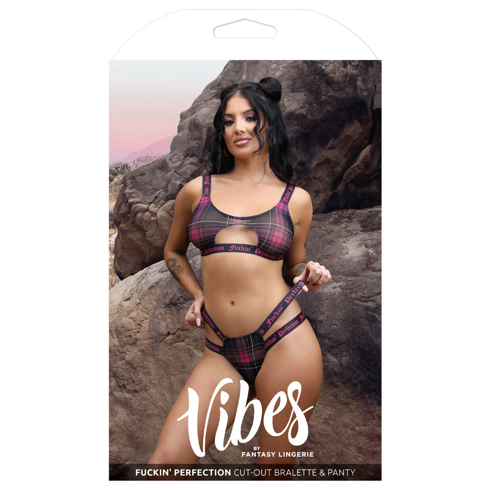 This 2-piece set sports a fun black and pink plaid pattern with matching elastic at the underbust, shoulder straps, and dual-strap cage panty that is emblazoned with a Fuckin' Perfection mantra in a baddie-inspired font to ignite your confidence. There are cutouts strategically placed at the centre of the bralette and panty sides to provide a tasty view of underboob, cleavage, and hips without actually exposing any of your intimate assets so you can strut your stuff in total comfort!