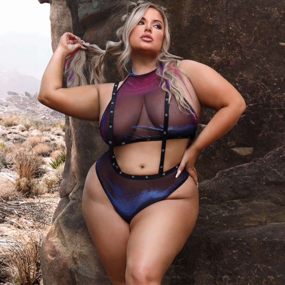 This curvy 2-piece set comes with a halter top and matching panties with that are sure to steal the show when the sheer, holographic mesh shimmers in the light and shifts between beautiful shades of iridescent indigo and violet. The elastic trim on the top's hem, the panty waistband, and the shoulder suspenders feature a silver star pattern and is topped off by star-shaped connectors in the rear for extra visual drama without any extra fuss. The star-printed elastic is also UV-reactive, lending an extra element of fun to your outfit as it transforms colour under the sunlight!