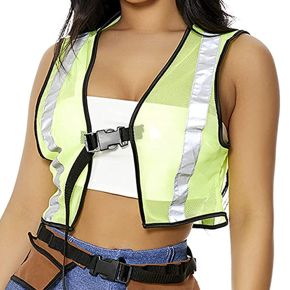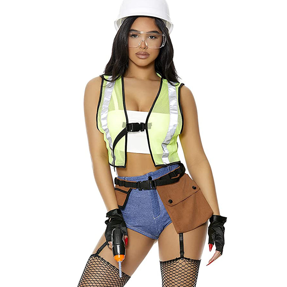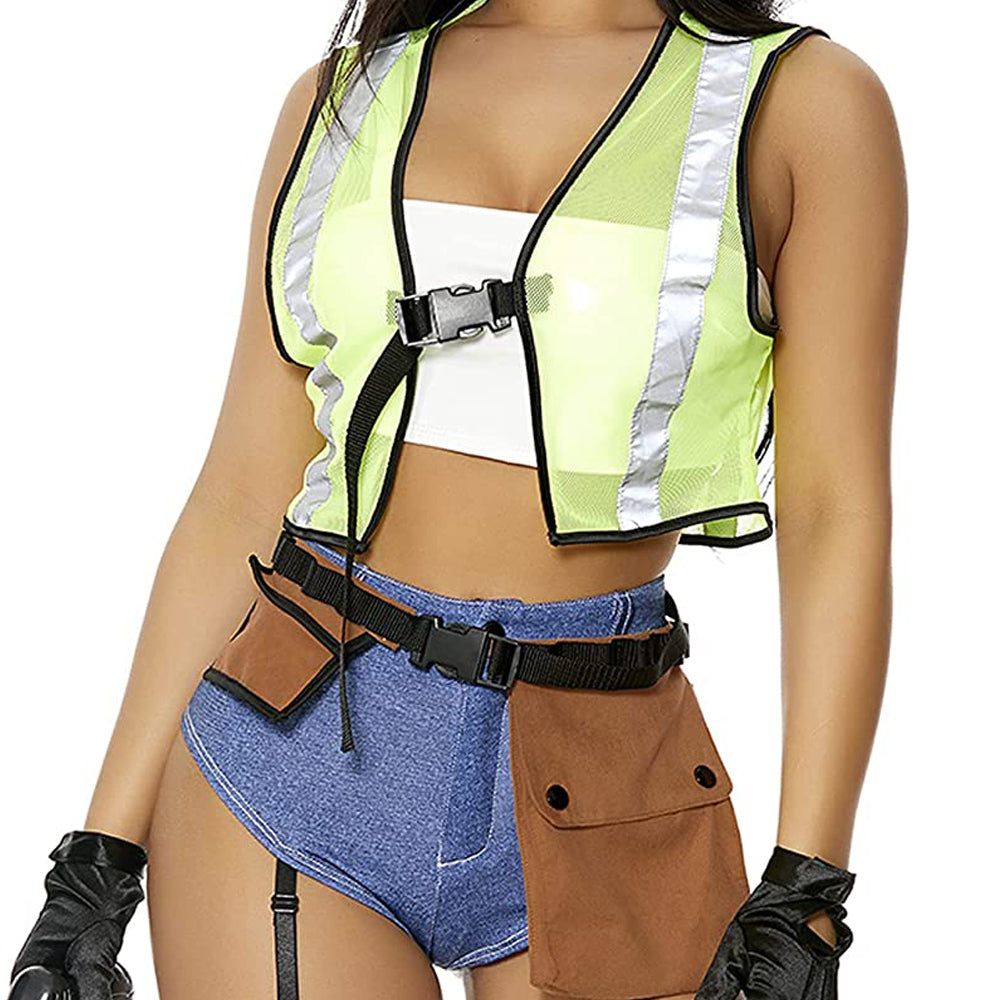 This sexy tradie costume will get you all the lads and the ladies, and comes with 6 pieces to give you the perfect look both on- and off-site. It includes a cropped fluorescent yellow vest, a cropped vinyl camisole, denim-look bottoms with attached garters, fingerless gloves, clear safety glasses, and a belt with functional pouches.