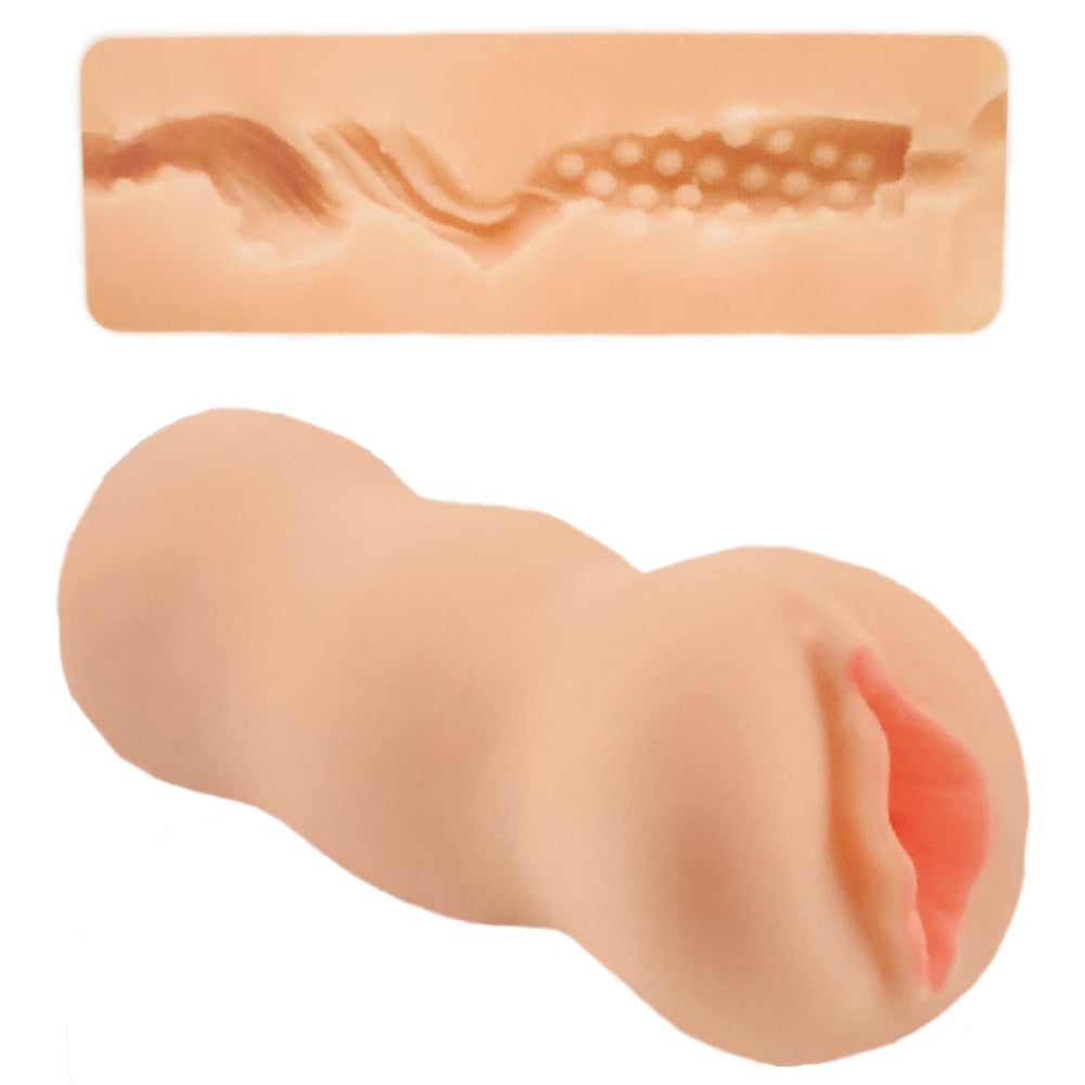 This stroker has a set of pretty pink lips sculpted to look like a vaginal opening, followed by a super-tight passage with almost zero diameter for a mind-blowing experience. The array of bumps and nodules along the length of the canal will rub and massage you with every thrust and stroke until your pleasure reaches explosive heights...