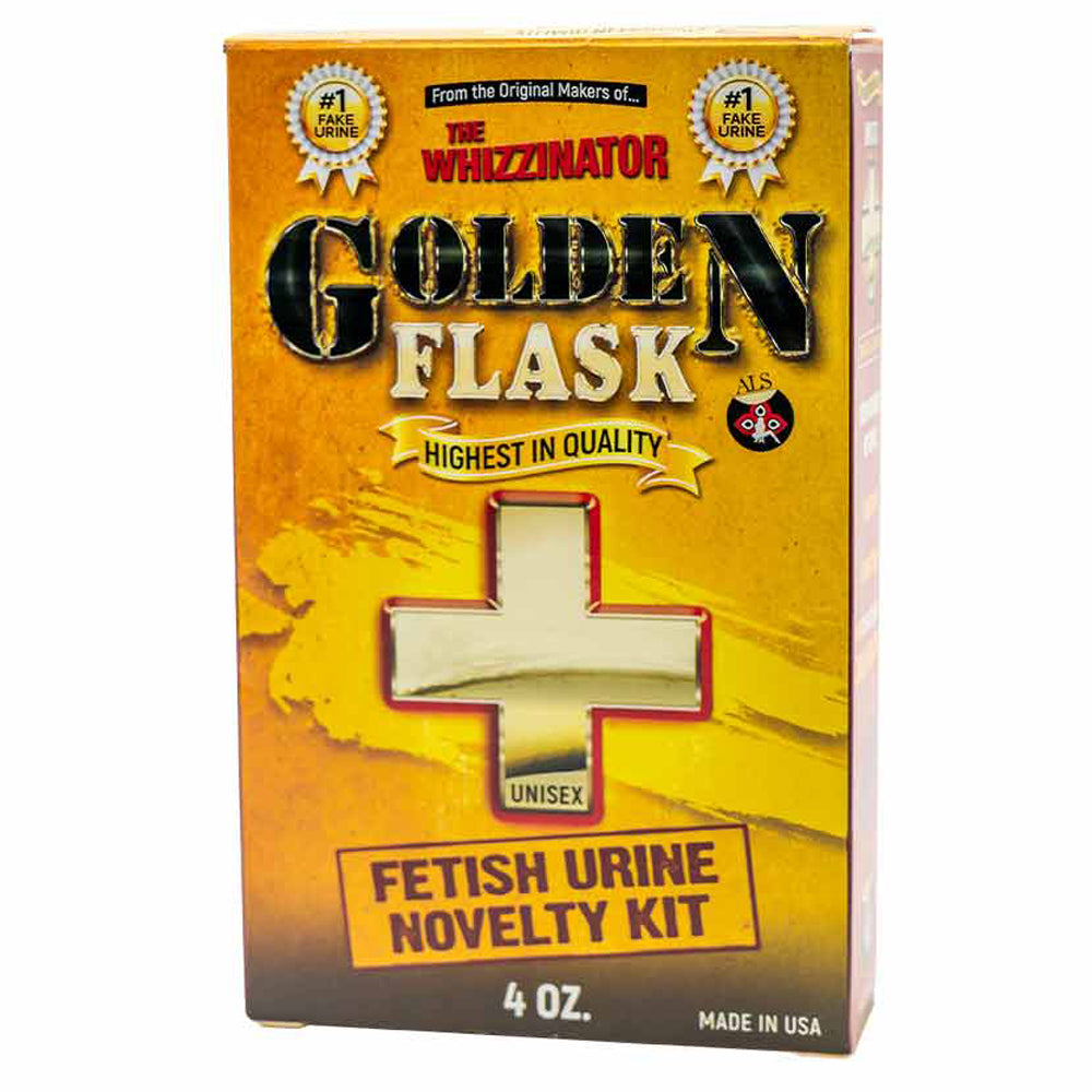 Always be ready to go for your next golden shower experience with the Golden Flask Fetish Fake Urine Novelty Kit!