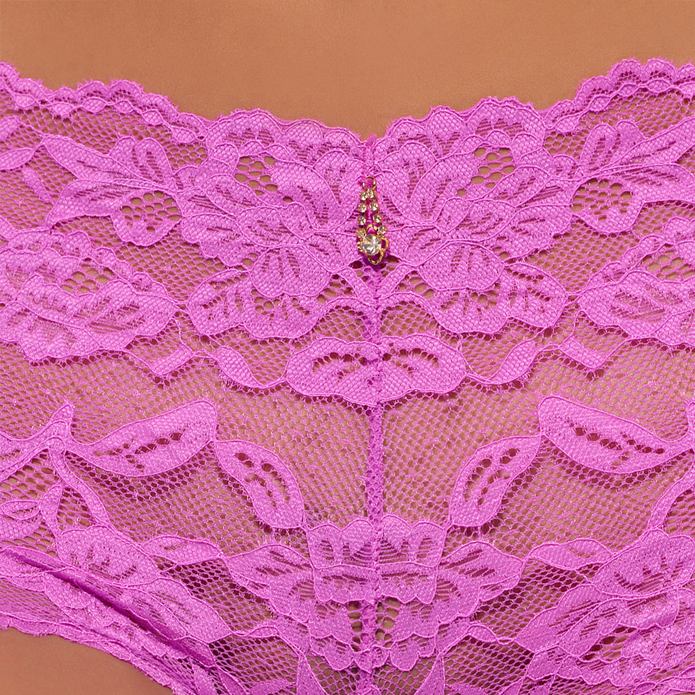 These alluring panties are crafted from exquisitely soft floral lace with feminine scalloped edges and a dainty rhinestone charm that dangles just above your intimate assets. The ultra-wide hipster design hugs your curves for a little extra coverage while the open crotch allows for easy access and effortless adventures under the sheets, solo or with a partner!