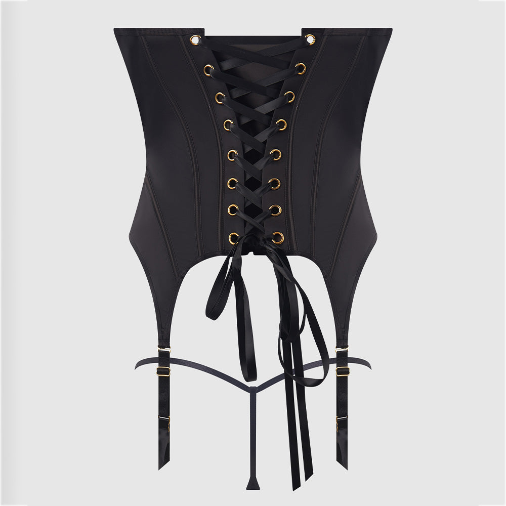 • Longline hook-&-eye closure + corset lacing for a secure, cinched-in fit