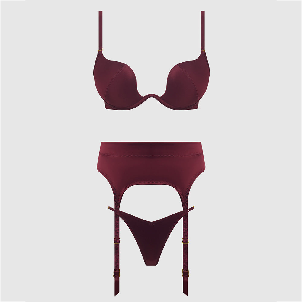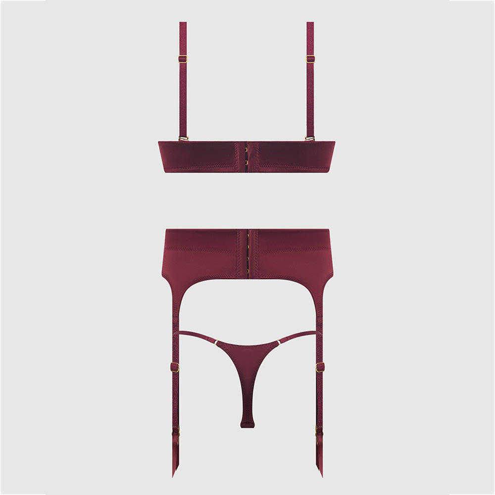Key features of the House of Desire Brigeta Satin Plunge Bra, Garter & Thong Set: