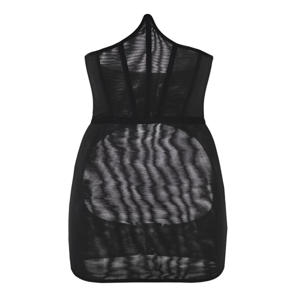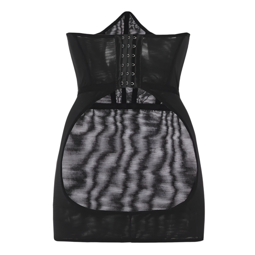This slip dress features a unique, modern design that cinches in your physique and enhances your curves, perfect for wearing as lingerie or as shapewear. The bodice is designed like an underbust corset, leaving your breasts bare and streamlining your torso with sturdy boning and durable yet breathable double-layered power mesh. This slip delivers a stunning view from all angles, of course — turn around and a generous cutout in the rear shapes, lifts, and frames your cheekiest assets, which are fully exposed through the tasty cutout window! When you're ready to rock the boudoir, simply adjust the longline hook-and-eye closure around your waist and get ready to dazzle!