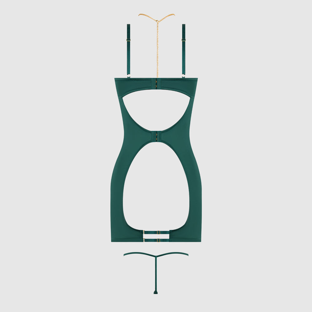 Key features of the House of Desire Evangeline Satin & Chain Open-Rear Chemise Set: