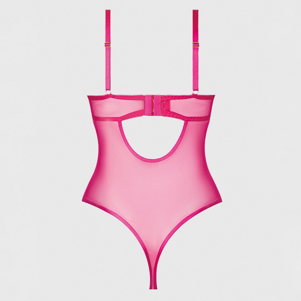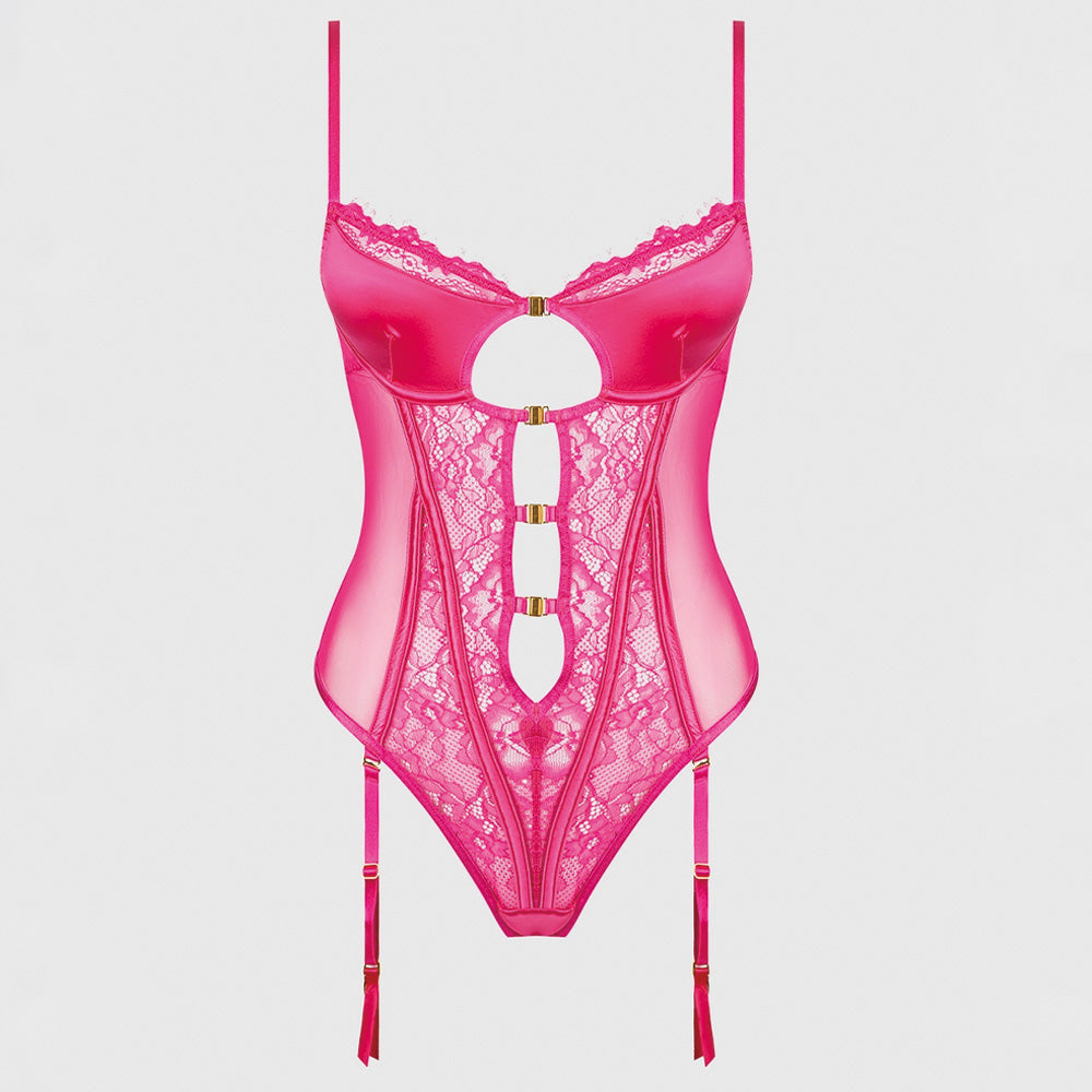 This elegant yet daring lingerie bodysuit is crafted from stretch mesh, scalloped eyelash lace, and buttery-soft satin, complete with polished gold hardware for a touch of luxury. The underwired cups help to lift, shape, and support your bust above a plunging cutout against the sheer floral lace, secured with golden clasps that allow for an easy and tantalising reveal as you pop each of them open, one by one...