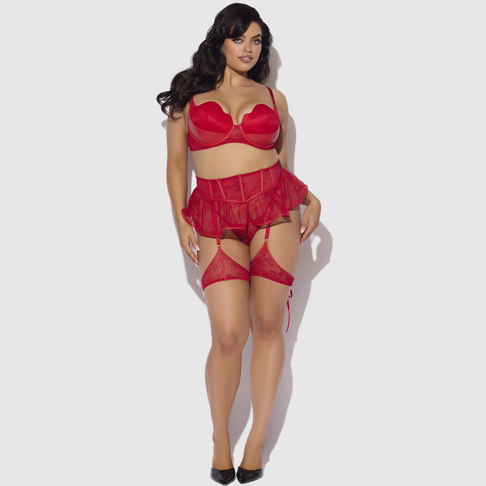 Captivate your lover with an unforgettably unique lingerie look thanks to House of Desire's Plus-Size Kiki Sheer Lace Flounce Corset Garter Skirt...