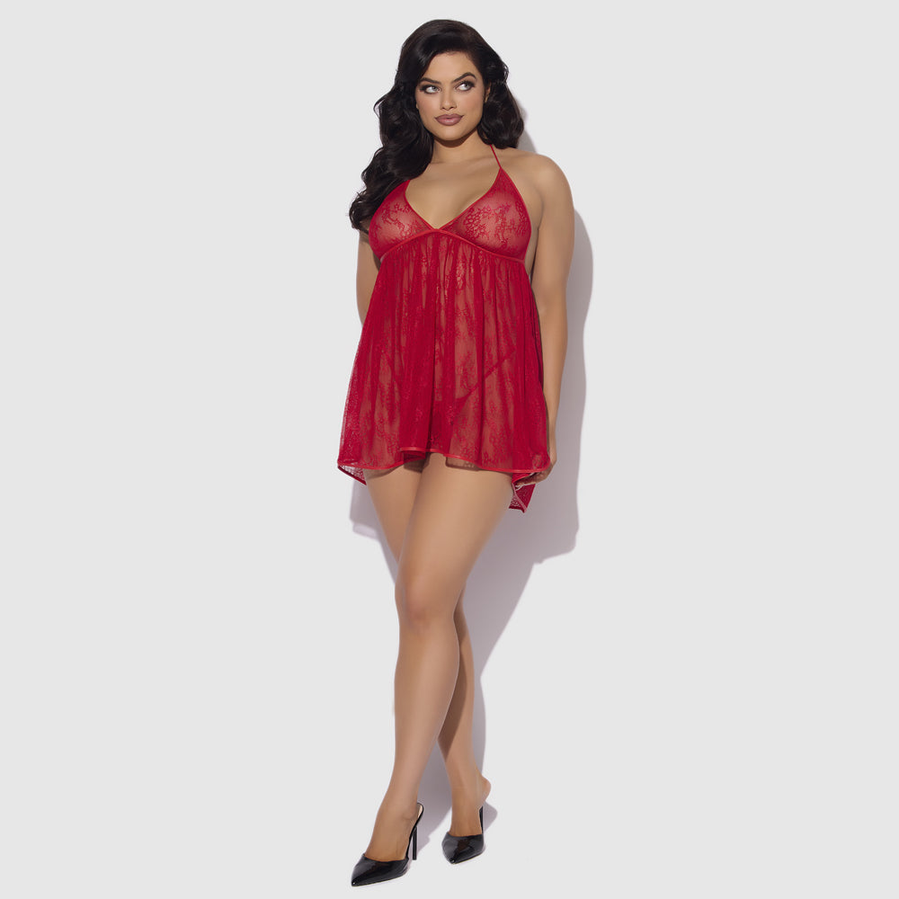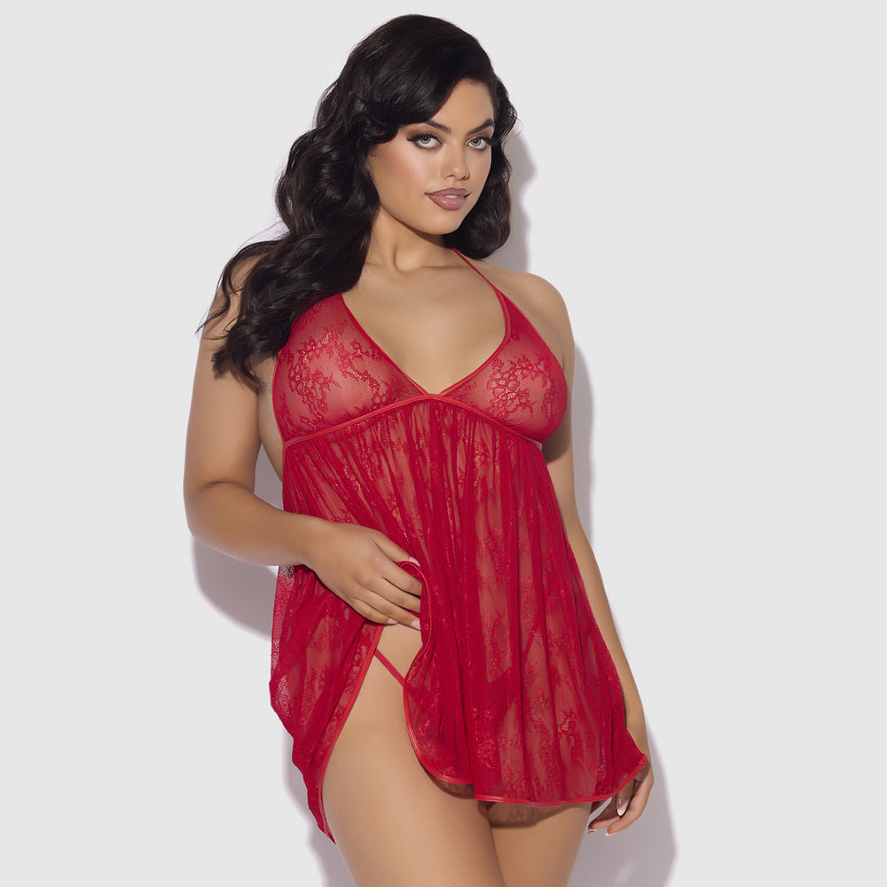 Combine sweet and sultry style with the Plus-Size Kiki Sheer Lace Open-Rear Babydoll & G-String from House of Desire!