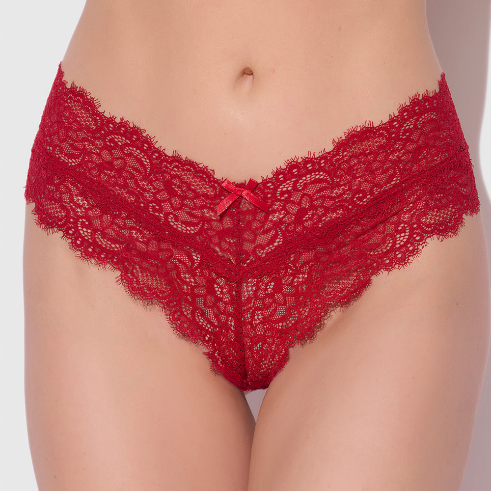 This playful panty is made from floral lace with a sweet ribbon detail, complete with feminine scalloped eyelash trim and an extra-sheer finish to let a tantalising amount of skin peep through the soft fabric. The V-shaped silhouette emphasises the curves of your waist and hips while the cheeky thong-style rear disappears deliciously between your buns, making them look full and round so you can be sure all eyes are on you as you strut your stuff!