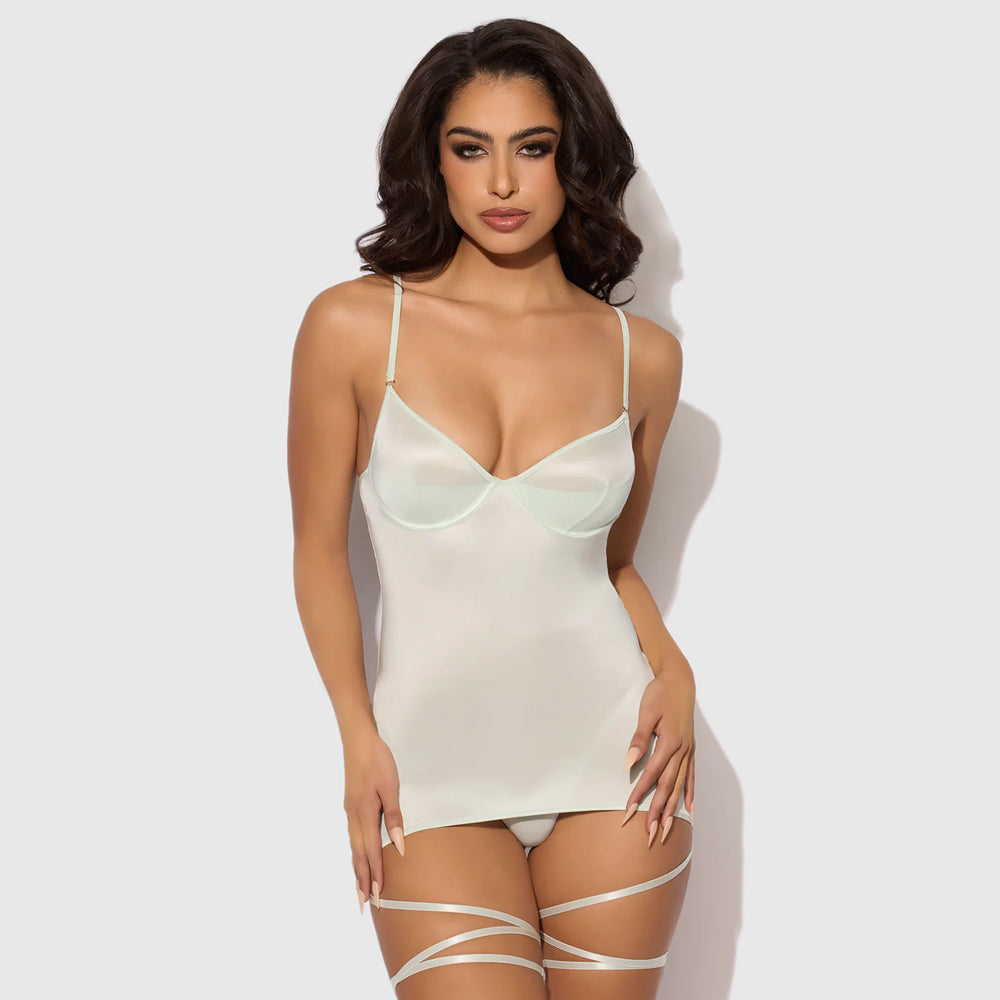 Key features of the House of Desire Zoe Satin Chemise, Wrap Garter & Thong Set: