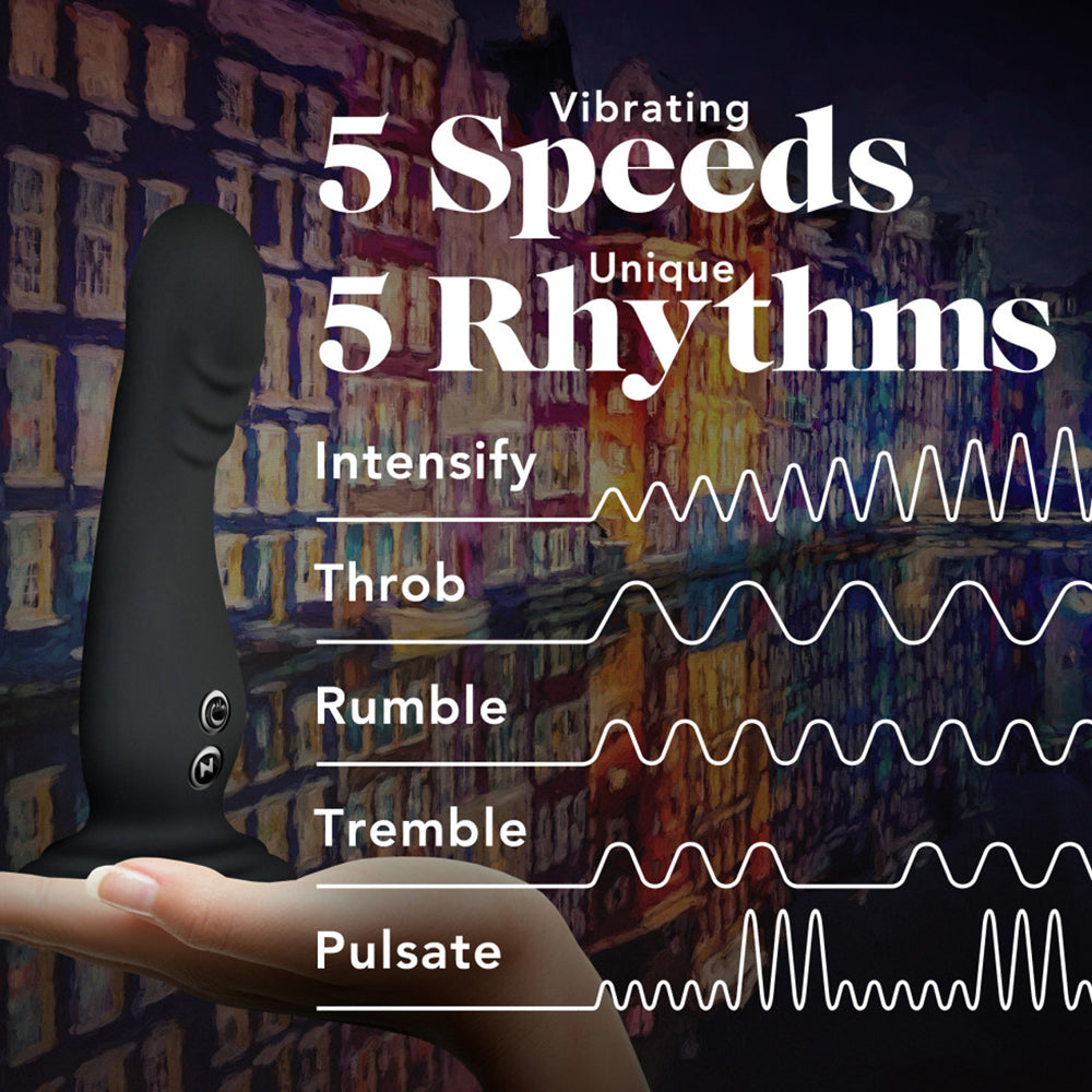 The Impressions Amsterdam Ribbed Dildo is made from Puria™ platinum-cured silicone and coated with Ultrasilk™ silicone for a seriously smooth finish. The waterproof material is perfect for playtime in the shower or tub and cleans up easily with warm water and toy cleaner. Afterwards, the magnetic charger snaps into place to power up your Amsterdam Dildo for your next round of fun!