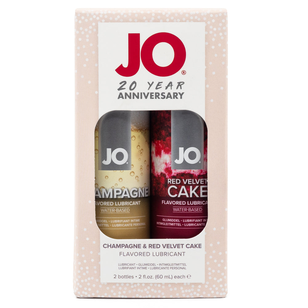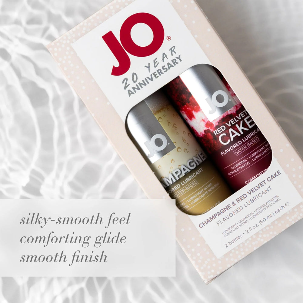 Treat yourself to a tasty celebration under the sheets with JO's® Champagne & Red Velvet Cake Flavoured Lubricant 2-Pack!