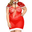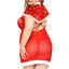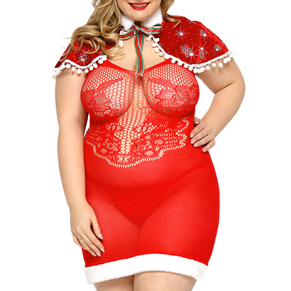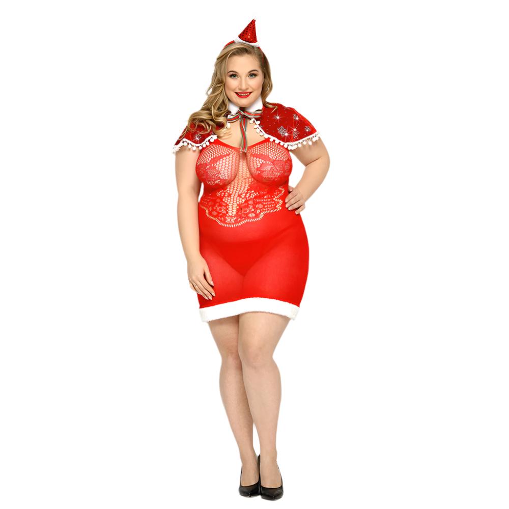 This sexy Xmas costume flatters your full figure with a stretchy net dress made from bodystocking material, thong, a velvet capelet, and a mini Santa hat on a headband to top off your look. The dress features a tantalisingly sheer construction to reveal your skin and the included G-string behind the material, as well as a lace-like net design over your torso that reveals just the right amount of your bust to earn you a spot on Santa's naughty list!