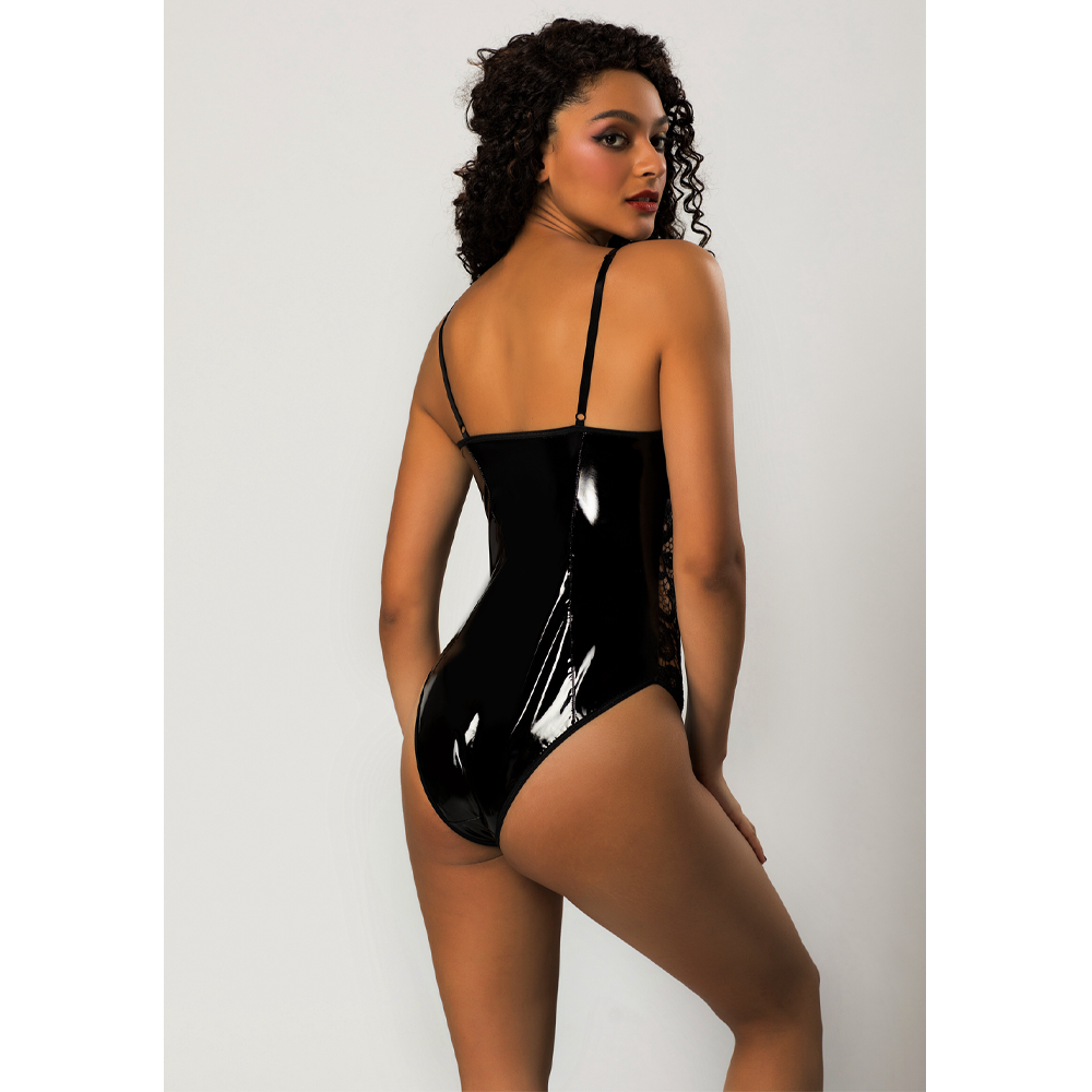 This unique bodysuit is made from high-shine wet look material, spliced with lace in a swirling crochet-like pattern at the sides to reveal tantalising glimpses of your skin that's sure to turn heads at fetish parties and more. The latex-like sheen catches the light with your every move while the stretchy, figure-hugging material shows off your physique providing a comfortable amount of coverage with the bikini-cut rear. In the front, the sweetheart-style neckline enhances your bust and reveals just the right level of cleavage for wearing behind closed doors or out on the town for a fun night out! Wear this bodysuit on its own or tuck it into your favourite skirt or pants and rock the night away...