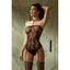 This sultry one-piece consists of a strapless bodysuit with a shimmering collar and bodice trim, and matching thigh-high stockings that are attached in the front and back via sleek suspenders for head-to-toe hotness. The intricate lace net material is embroidered with heart shapes, adding a touch of romance and sophistication to this sheer, steamy look. In the rear, the cheeky-cut bottoms put just the right amount of your buns on display, ensuring you look good enough to eat from any and all angles...
