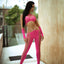 This eye-catching bodystocking sheathes your physique in a stretchy hosiery material spliced with fishnet panels at your décolletage and down the outside of both legs to play peekaboo with your skin in a stunning halter neck design. The halter top connects to the low-waisted footless pants section in the front and back via sparkly torso straps in an elongating V-shape, giving you one-piece simplicity so you can step into this bodystocking and be ready to dazzle in an instant. Add on the included elbow-length arm warmer sleeves to top off your look and you're ready to rock the rave or festival!