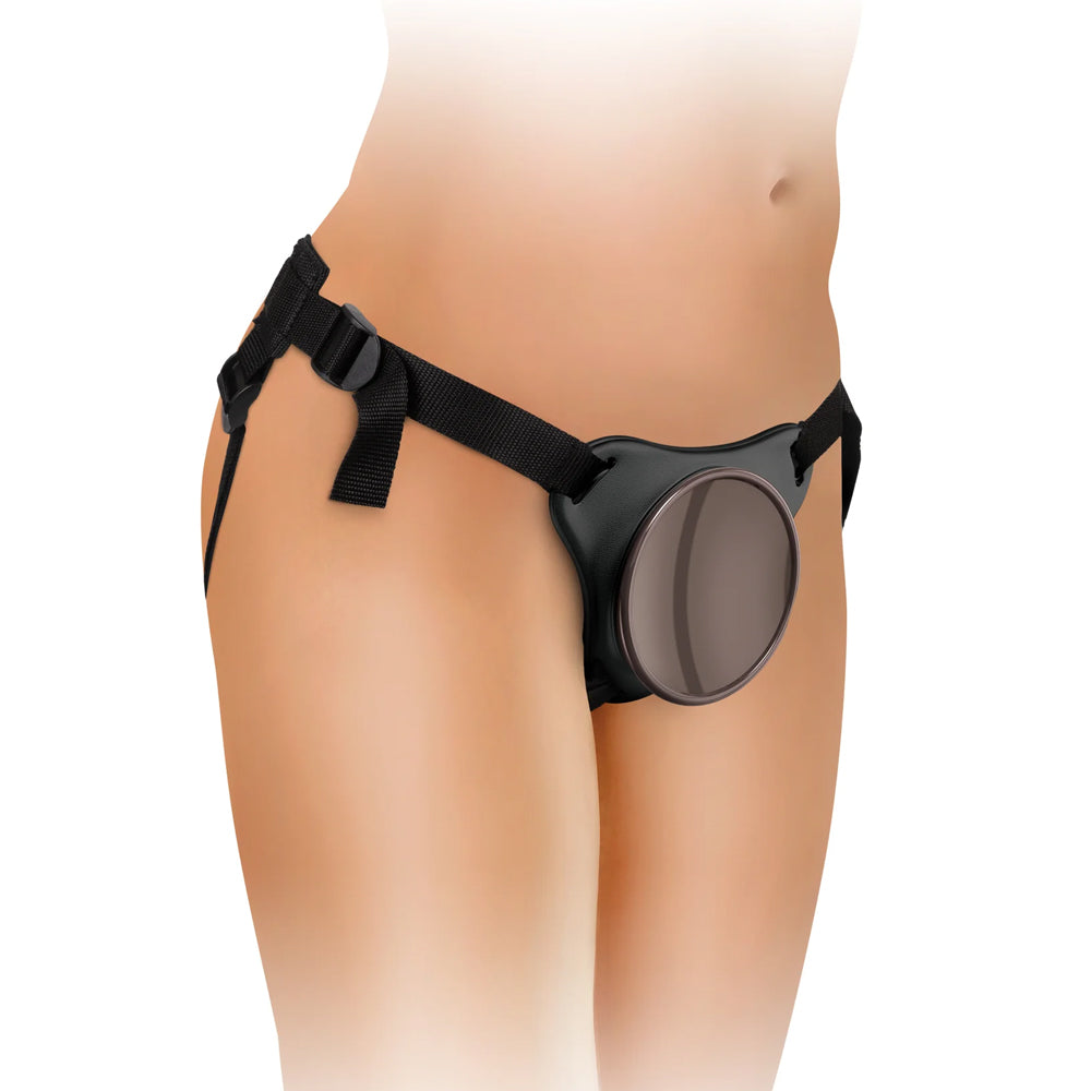 This patented universal harness system revolutionises strap-ons with its easy-to-use suction cup that offers a super-secure hold on suction-cupped toys like dildos and probes (sold separately). The wide, concave silicone docking plate has a push-and-play design that works best with toys that have suction cups measuring up to 8.6 centimetres or 3.4 inches in diameter — just press the toy's suction cup into the concave plate and push out all the air for a sturdy grip that won't go anywhere during playtime! The docking plate is even angled upward so your dildo won't droop and stands up and at attention during play. Swapping between toys and accessories during strap-on play is faster than ever now so you never have to put the fun on pause for too long...