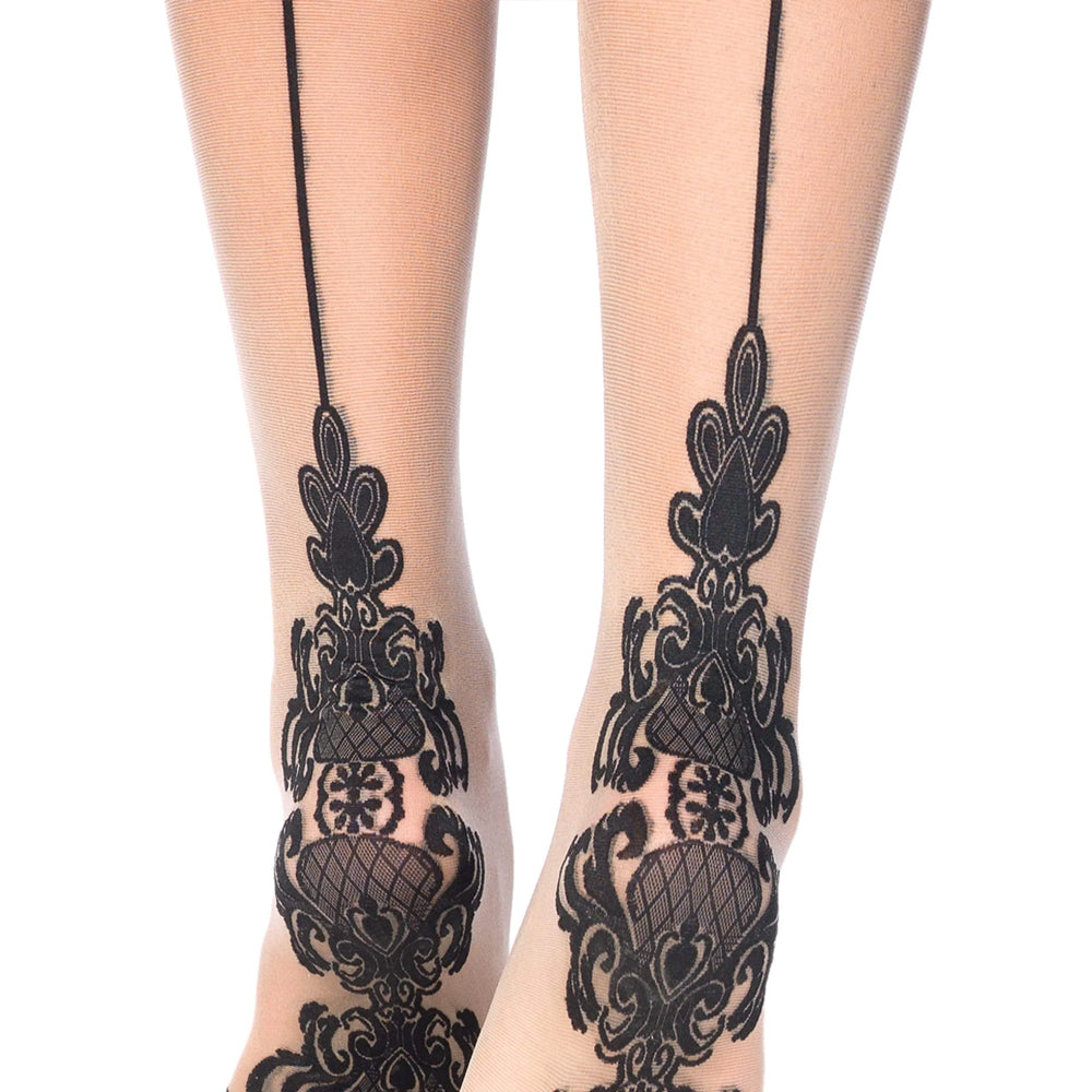 These elegant thigh-high stockings give regal vibes with their intricate baroque patterning at the mid-thigh and heel, joined by a back seam detail that makes your legs look like they go on for days. The luxurious rear is complemented by the completely plain fronts and solid hold-up thigh bands for an understated, classy finish that lets other elements of your outfit shine, like your garter belt (sold separately). The Tana Baroque Hold-Up Thigh-High Stockings are a fabulous addition to any outfit, from everyday dresses and skirts that need an injection of glamour to lust-worthy lingerie looks!