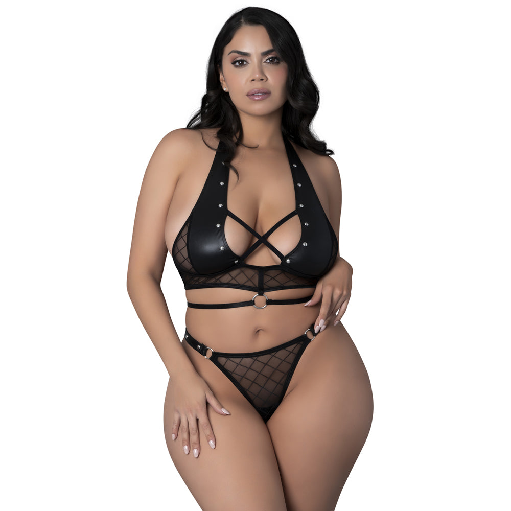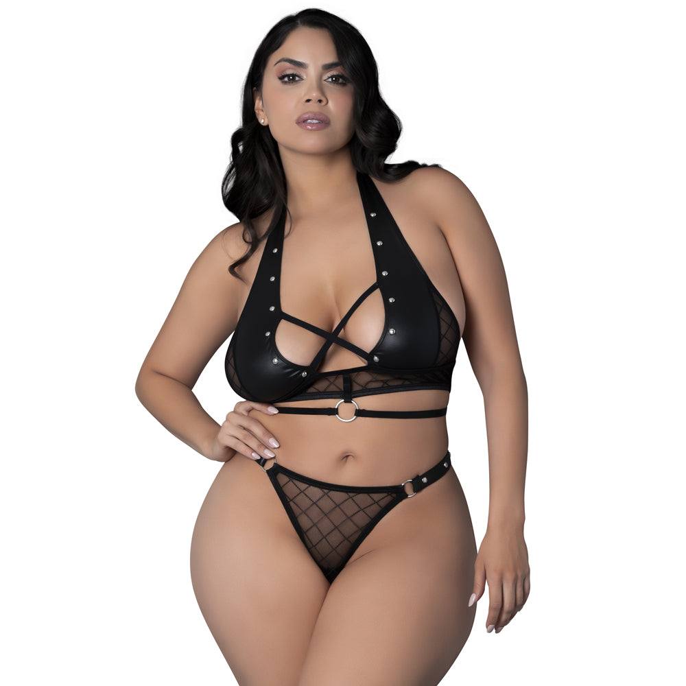 This 2-piece lingerie set flatters your full figure with a bold combination of 4-way stretch faux leather wet look and diamond-patterned mesh that mimics the edgy look of fishnets. The striking wire-free halter top reveals the perfect window of cleavage thanks to the generous plunging neckline that's accented with crisscross details and metal studs for extra visual drama. Beneath the diamond mesh underbust trim, a subtle cage straps wrap around your ribs and connects to a metal O-ring that's compatible with BDSM accessories like cuffs, rope, or leashes (all sold separately) so you can indulge in kinky restraint play!