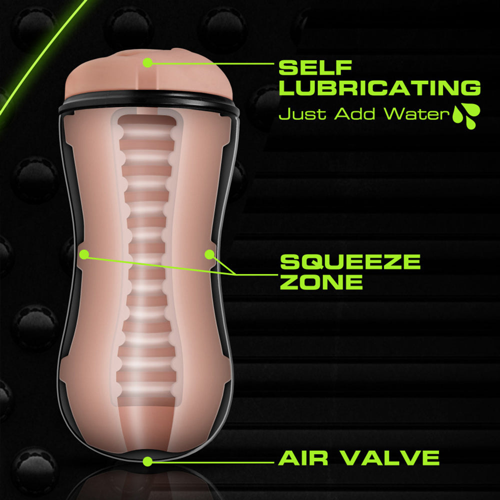 This compact masturbator contains a beautifully sculpted vaginal entrance for you to slip inside of, with a series of sensational ridged textures inside that are just waiting to massage you all over. The case comes with a discreet storage cap and has a contoured shape that curves in at the middle for you to squeeze, which controls the tightness as you stroke. You can also open or close the air valve for more varied suction intensity and pleasure! The soft and flexible TPE material is self-lubricating for up to 12 uses — just add water to get the fun flowing, and switch to water-based lubricant once the self-lubrication is done.