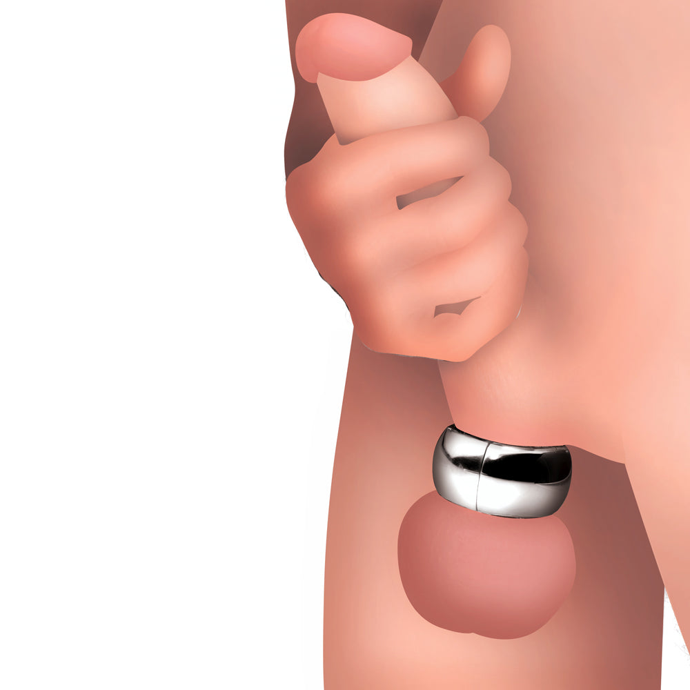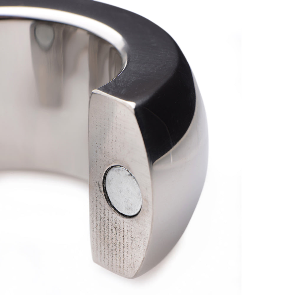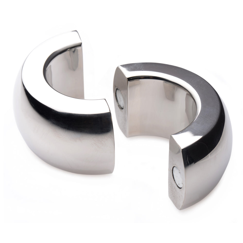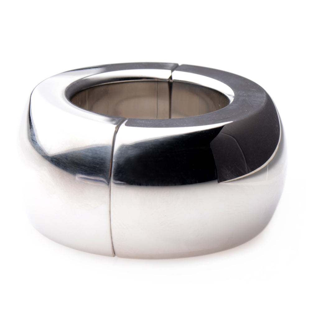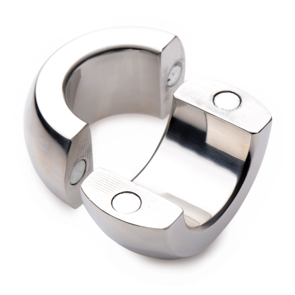 This cock and ball torture (CBT) toy is a heavy magnetic ring that's made from nearly a pound of stainless steel to provide a strong stretching sensation as gravity helps it pull his testicles down. The two magnetic halves are easy to secure and detach for quick play and removal, perfect for masturbation on his own, sex together, or punishment for when he's been a bad boy...