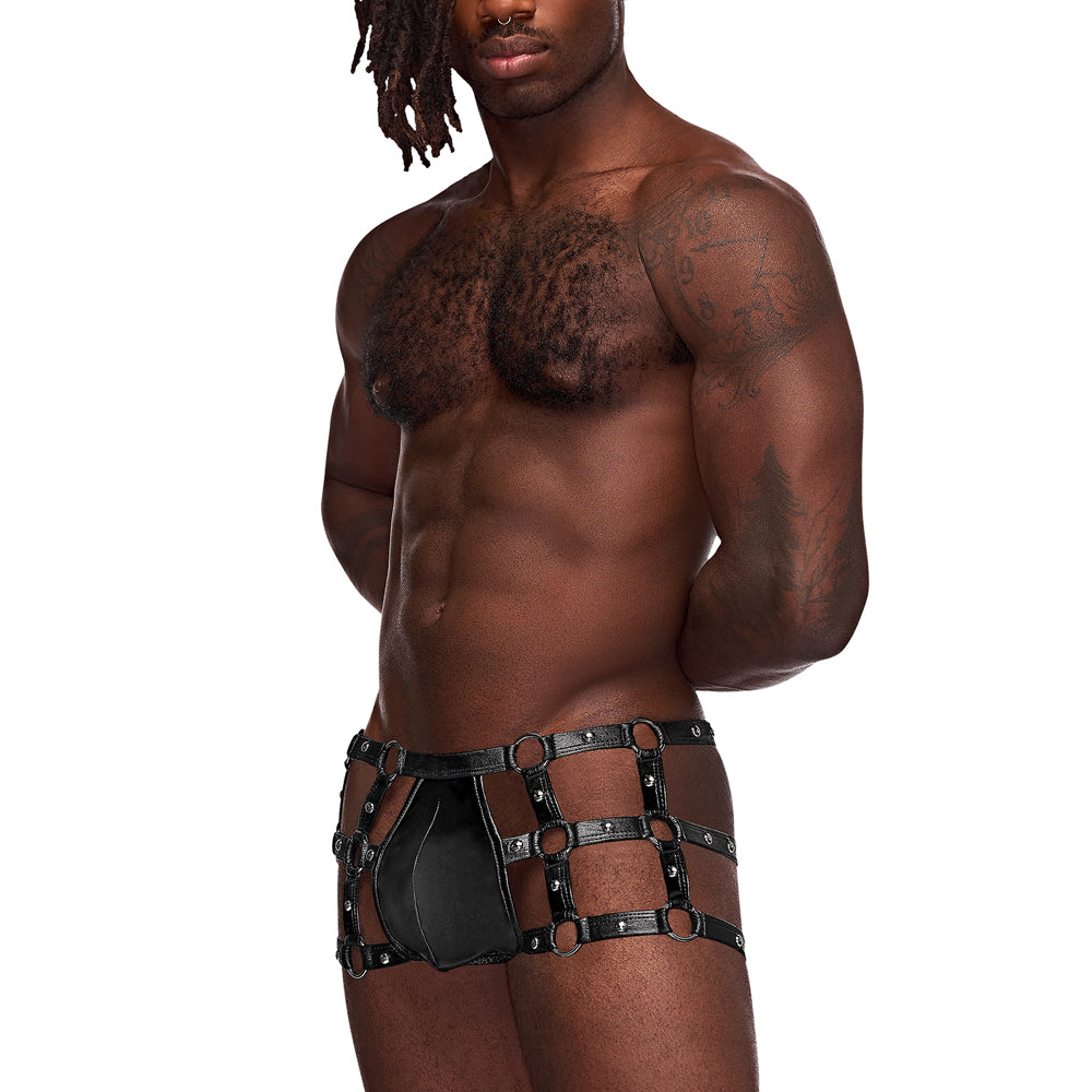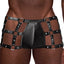 This men's fetishwear combines faux leather wet look material with cutout sides and metal studs to reveal sections of your skin along your hips and thighs for an eye-catching look that's perfect for private play or showing off at a fetish event. The O-rings are also compatible with BDSM accessories like leashes, cuffs, and rope (sold separately) for extra fun!