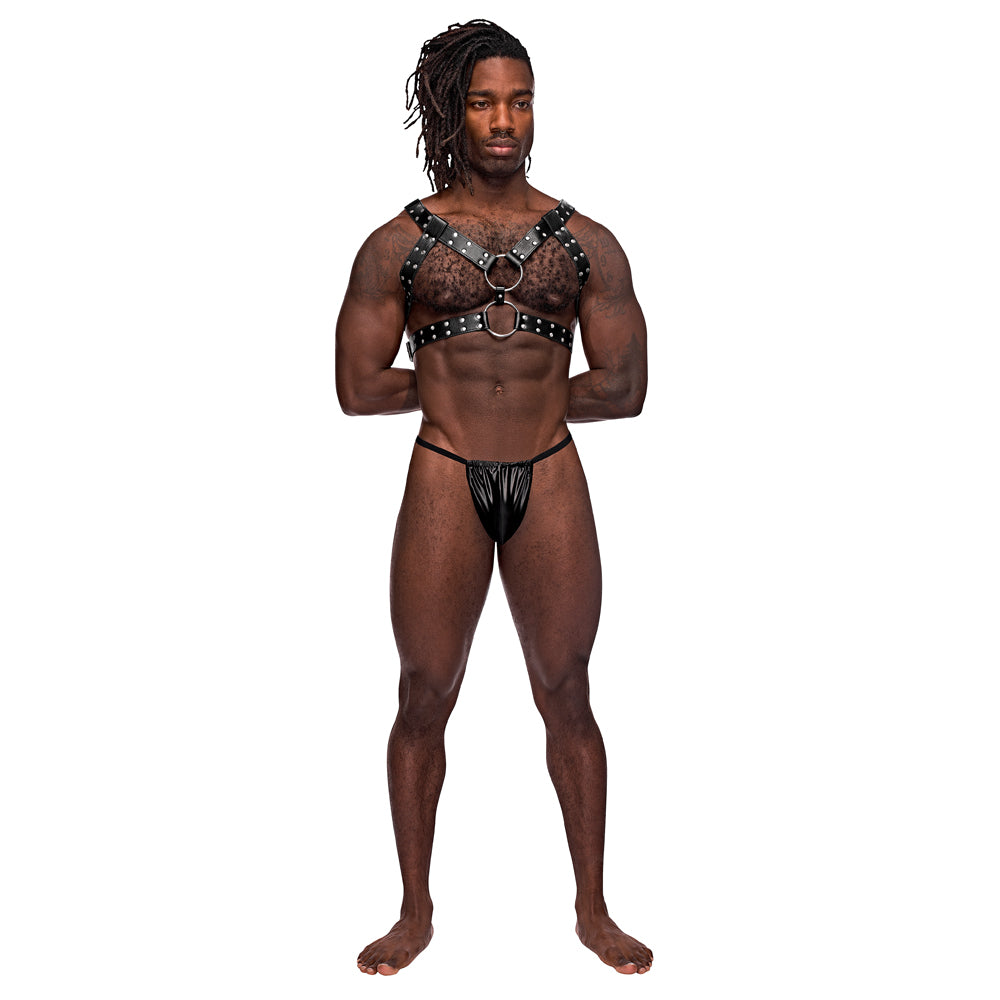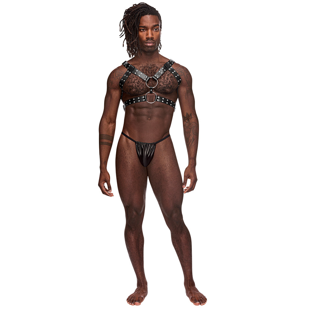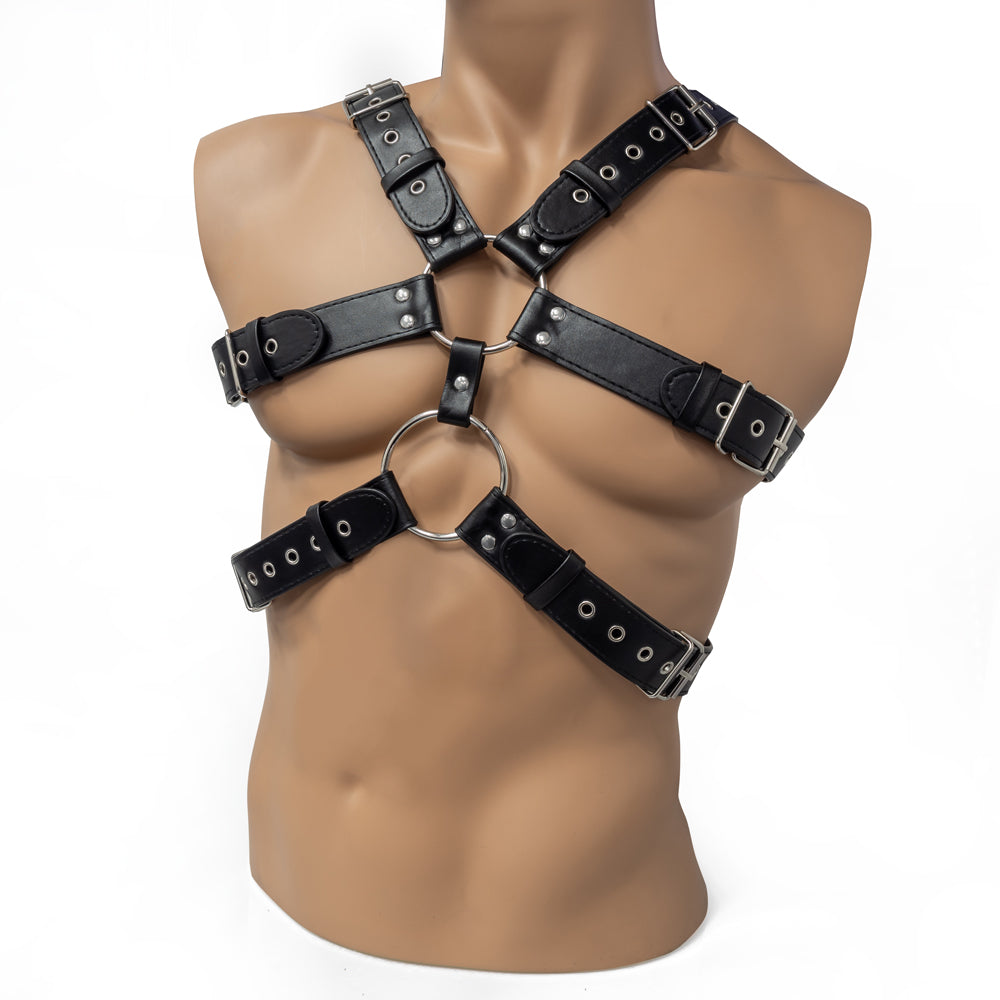 This men's fetishwear harness is a must-have for any leather enthusiast and is made from vegan-friendly faux leather for more kinksters to enjoy. It features dual O-rings in the front and back that are perfect for attaching bondage accessories like leashes, cuffs, and other restraints (sold separately), and you can wear it two ways for more versatility during play! The harness is embellished with striking silver metal studs for more visual interest and has 6 fully adjustable straps over the shoulders, under the arms, and around the torso for your perfect fit. Simply adjust the buckles to keep everything in place and you're ready to be the star of the club or dungeon!
