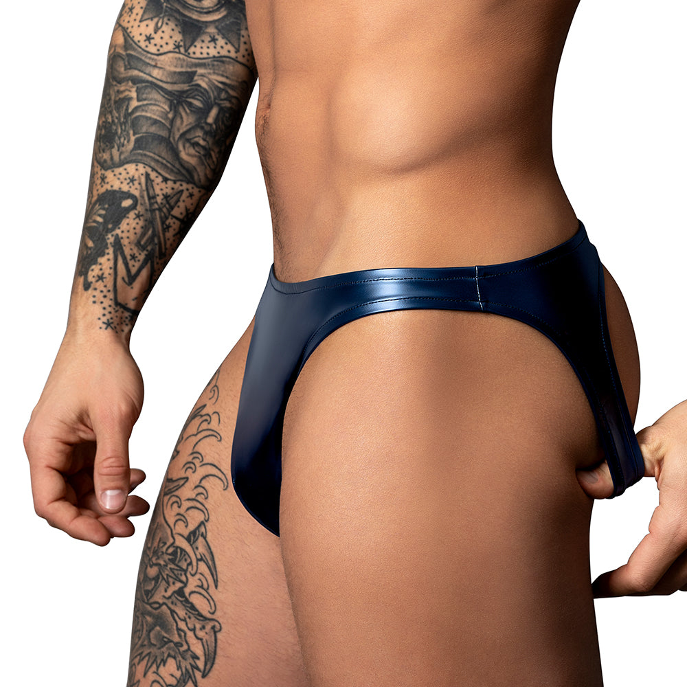 This uniquely edgy men's jock is made from an upgraded wet look fabric inspired by Male Power's original Liquid Onyx collection, now offering enhanced softness, improved stretchiness, and better flexibility for a confident, comfortable fit. The ultra-sleek material features a contoured pouch and mid-rise waistband to flatter your physique while the curved leg straps deliver full rear exposure in a supportive yet striking silhouette!