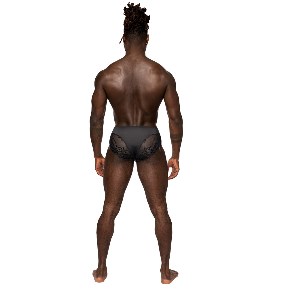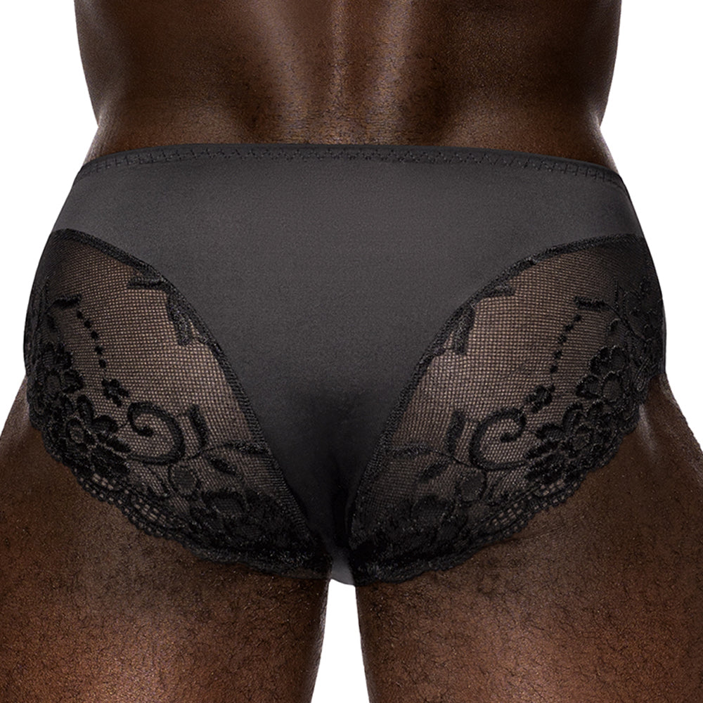These sexy men's underwear add a sensual, feminine touch to your lingerie look with sheer mesh panels in the front and rear that are adorned by floral lace. The soft scalloped edges around the waist and rear draw the eye to your package and buns while the opaque, quick-dry sides and pouch keep your package and hips under wraps. The bikini-cut design provides a feeling of more coverage while the cheeky-cut back and sheer lace ensure your lucky onlookers don't miss a thing...