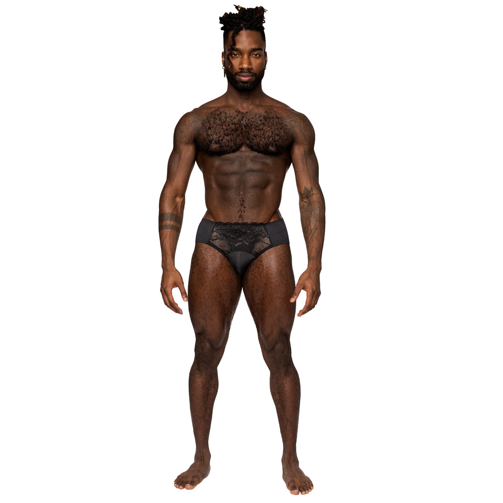 Put on an unforgettable peep show in the Male Power® Sheer Sassy Lace Solid Pouch Bikini Brief!