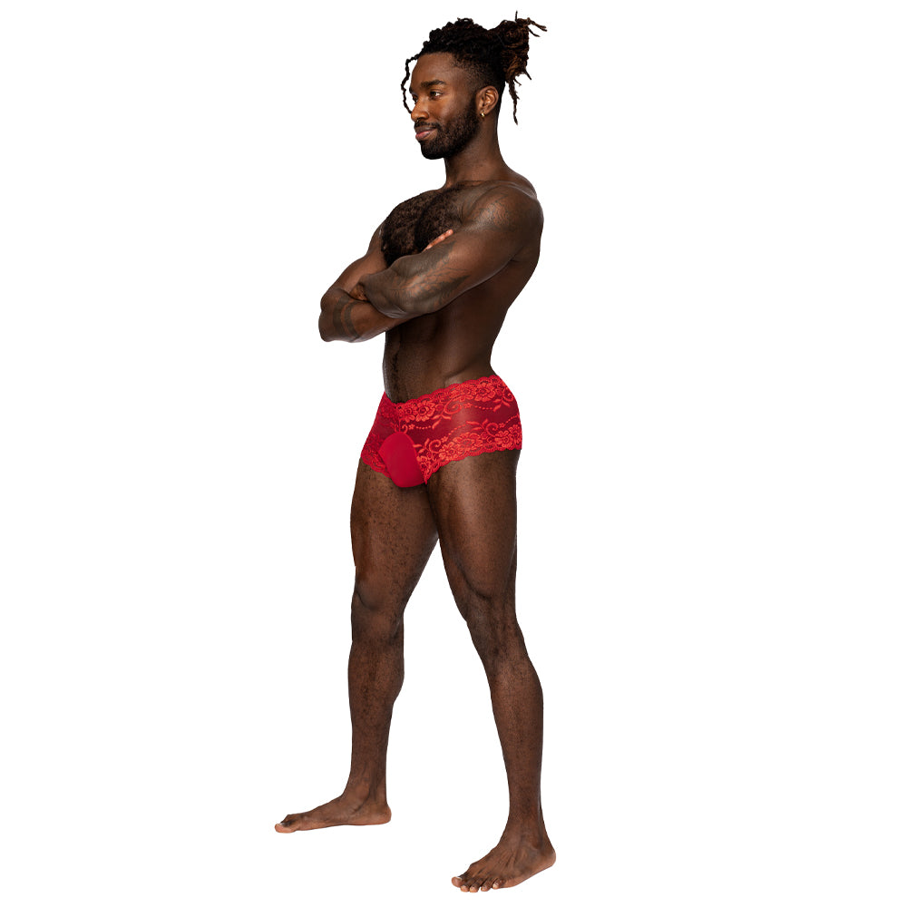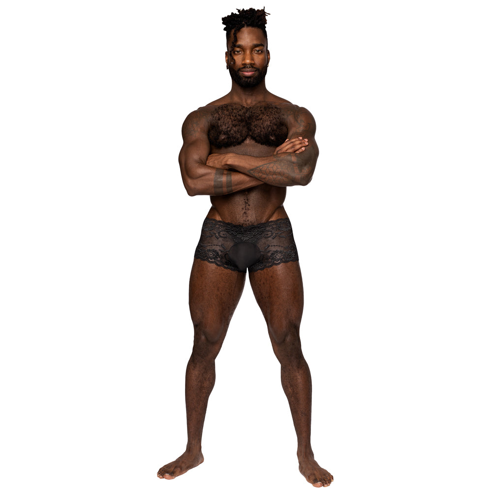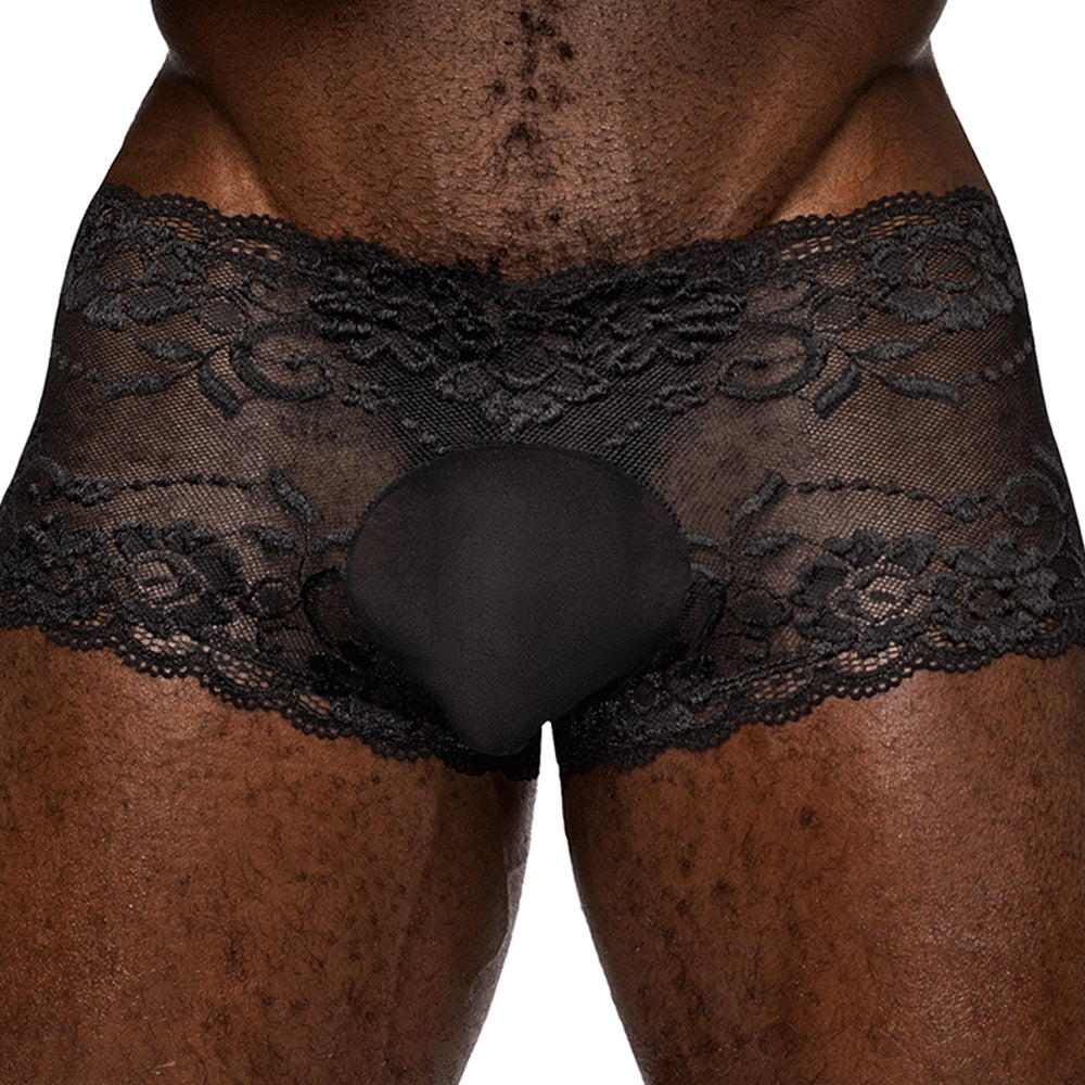 Get in touch with your feminine side in the Male Power® Sheer Sassy Lace Solid Pouch Mini Short!