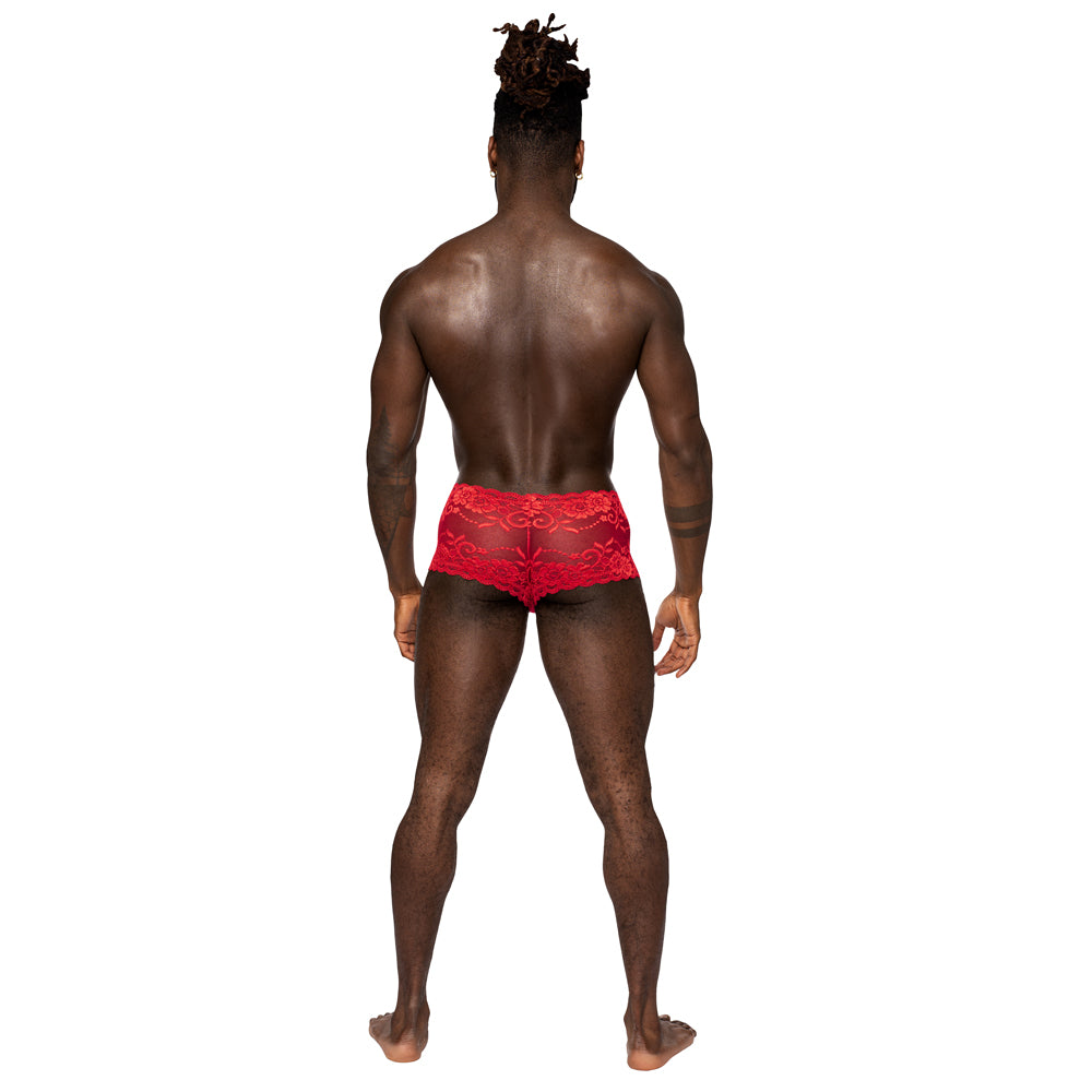 These classic trunk-cut mini shorts put an elegant twist on men's underwear with a sensual floral lace pattern and soft scalloped edges around the legs and waist. The opaque pouch keeps your package under wraps while the sheer stretch mesh material lets your skin breathe through the shorts and accentuates your buns with a flattering fit. The low-rise design offers a modern fit and is perfect for keeping hidden or letting peek out from the rest of your outfit!