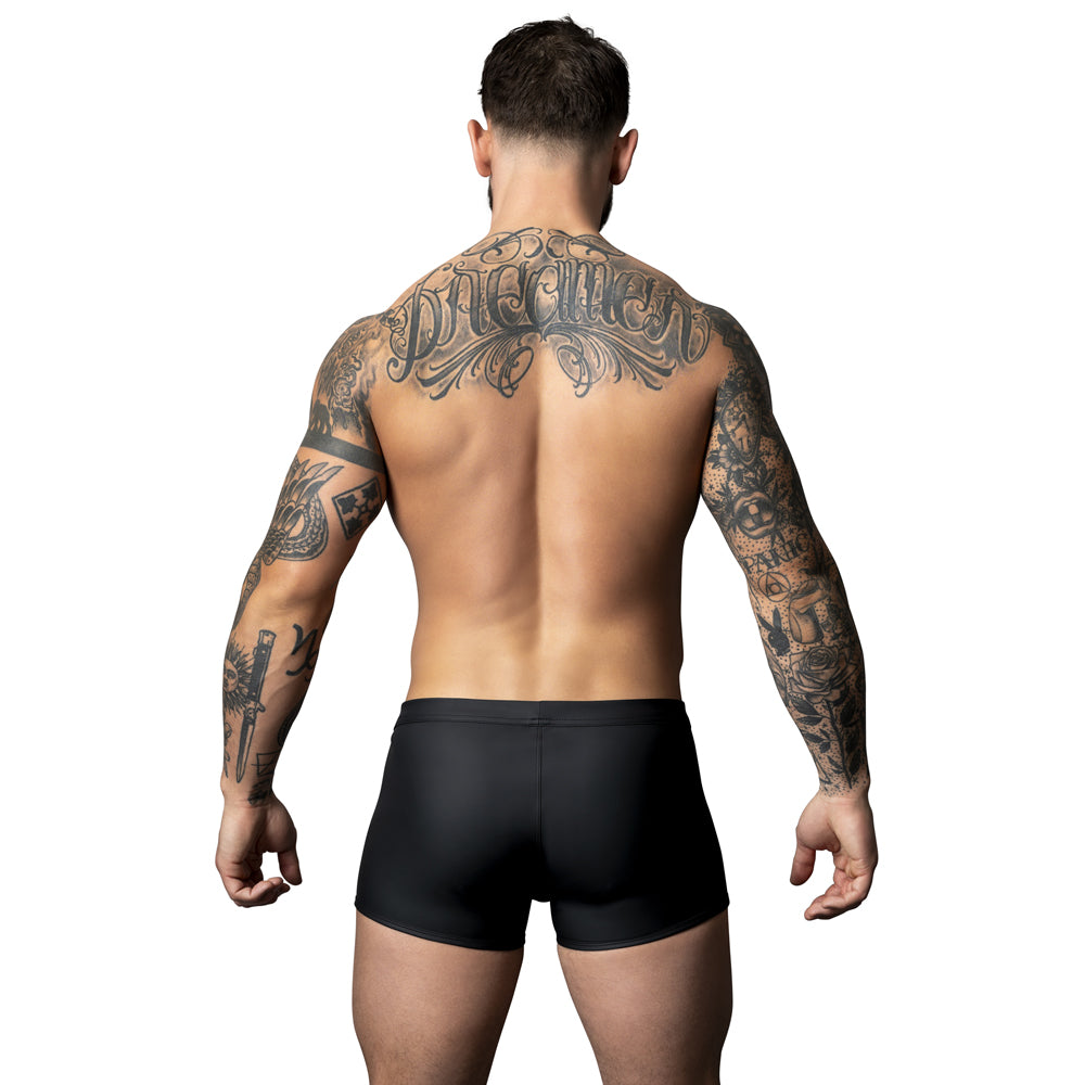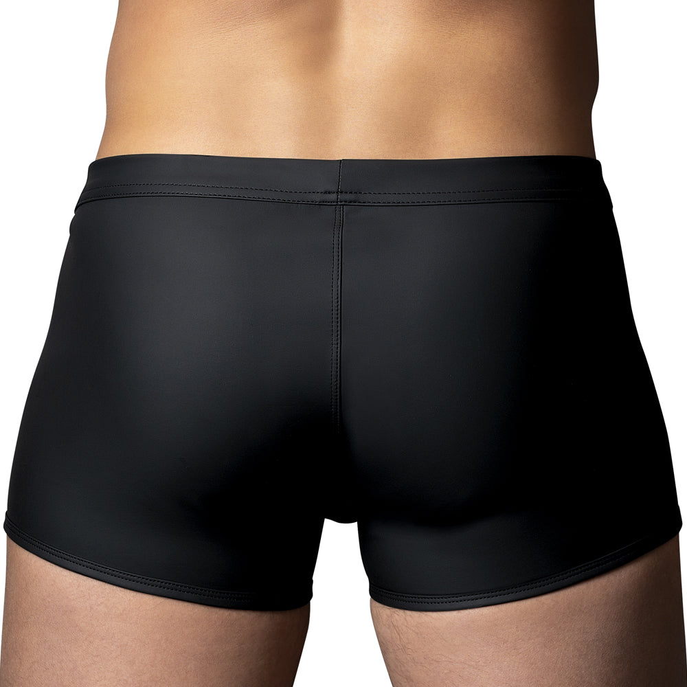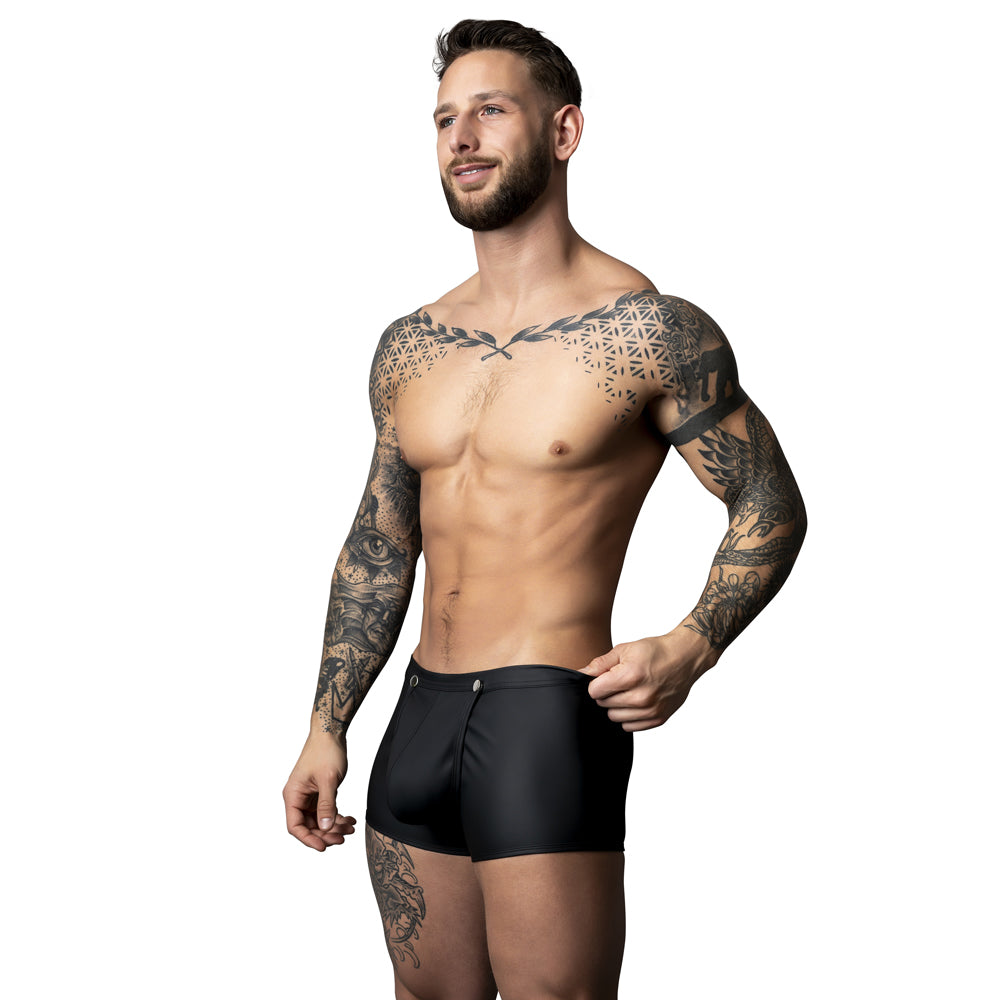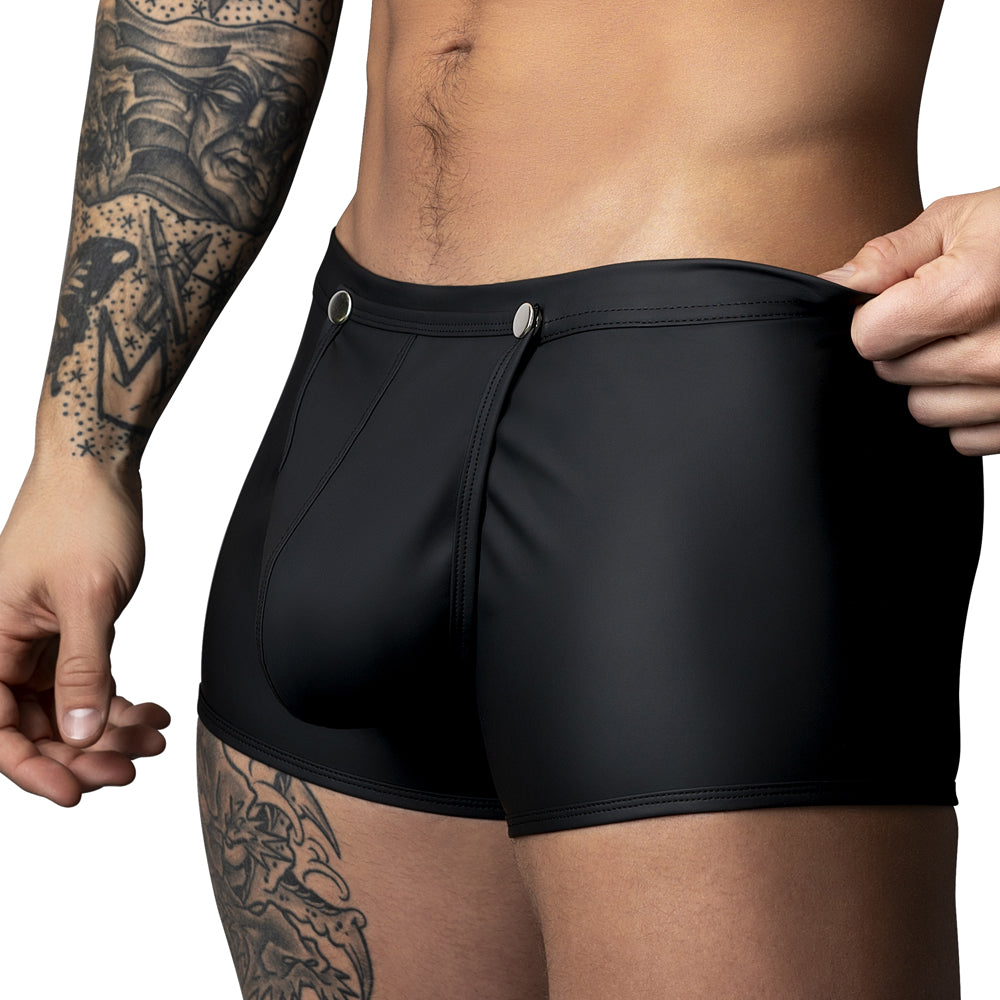 These classic-fit trunks feature a flattering low-rise waist and high-cut legs for comfortable coverage and are designed to deliver instant impact and an effortless reveal of your intimates. The sleek, rubberised spandex material stretches to conform to your physique and is adorned with a pair of functional, heavy-duty metal-plated snaps on the tearaway pouch that offers fast, on-demand access, perfect for everyday wear or partnered play! The flat matte black finish and comfortable coverage is sure to suit anybody's style and is discreet enough to wear with the waistband exposed for a cheeky finish under everyday clothing...