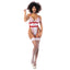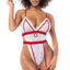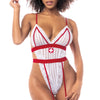 This revealing lingerie costume covers your most intimate assets (and not much else) in white striped mesh, accented with lace trim and contrasting red details, including a medical cross logo in the middle of your torso. The triangular cups create an enticing V-neck that puts just the right amount of cleavage on display, extending up into adjustable red shoulder straps for your best fit. The ultra-high-cut leg exposes your sides, emphasising your curves while elongating your legs for a streamlining effect that will have the whole ward's heads turning your way! The wide underbust strap and waistband secure your look together in the back with easy swan hook closures, above a cutout rear that leaves your cheekiest assets exposed as the thong coverage disappears delightfully between your buns...