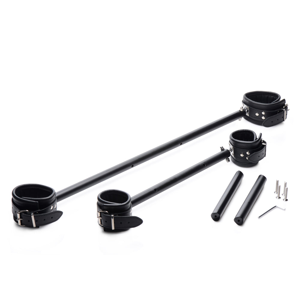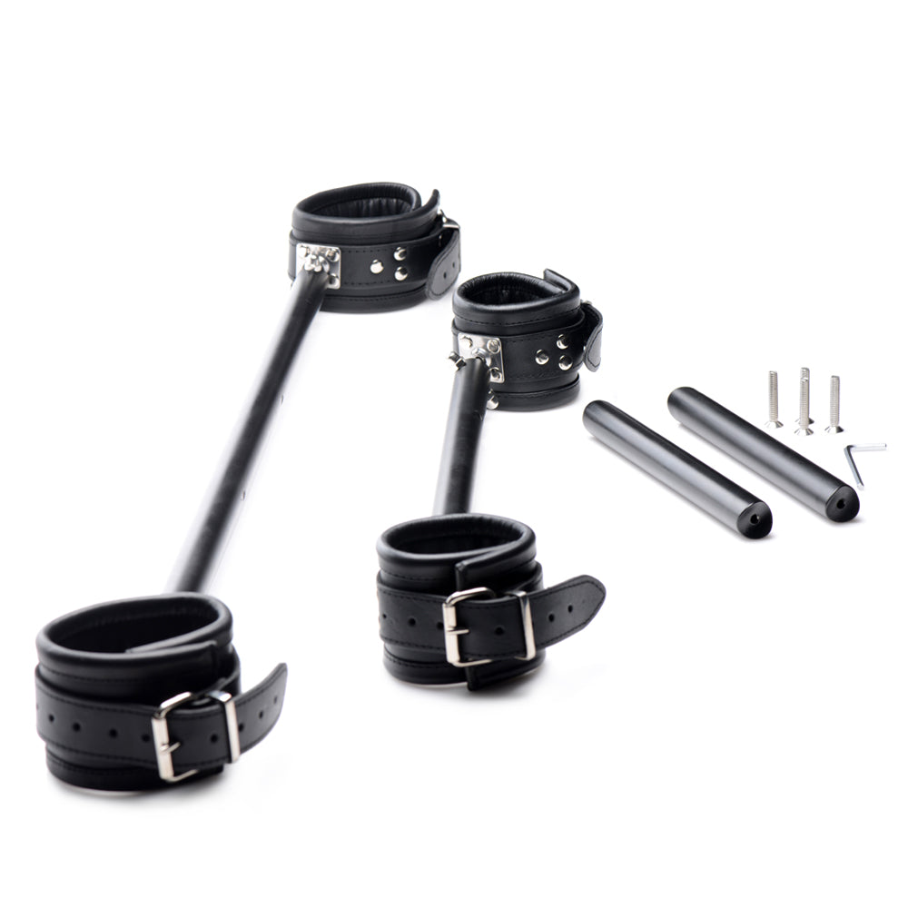 This 8-piece spreader bar kit is designed to pry open all of the wearer's limbs and can be used together or as two separate bars for individually spreading their arms or legs. The connector bars attach with a screw on either side for the ultimate security and an inescapable hold on your lover, with an Allen key included so you can lock everything in place with ease. Both bars come with a pair of sleek leather cuffs attached at either end, which have a soft, thick design to keep your captive comfortable, even if you intend on keeping them trapped all night long...